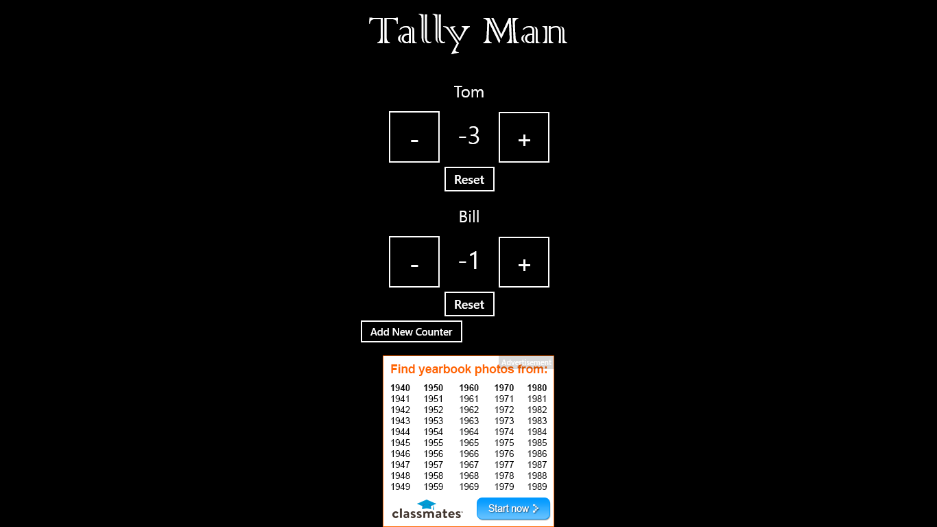 With Tally Man you can keep count of almost anything! Use Tally Man to keep sports scores or stats, perform polls, or count whatever you want.