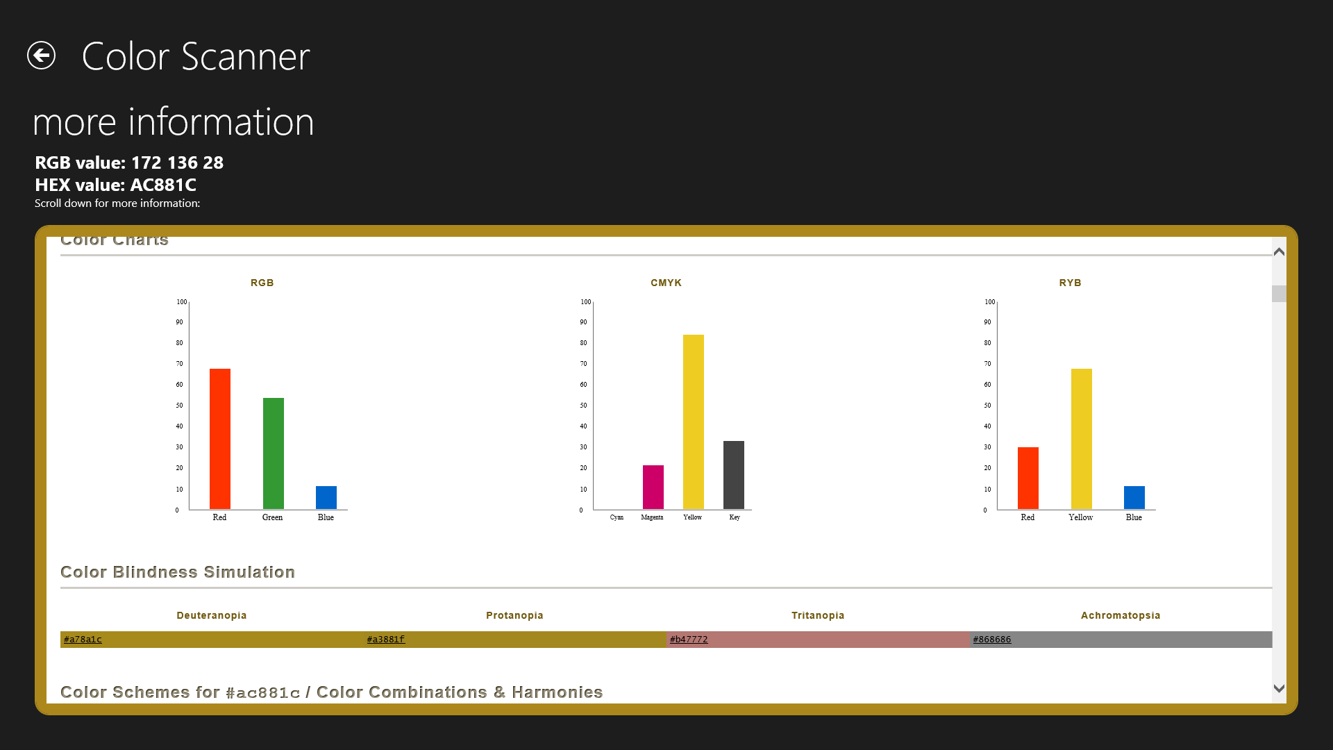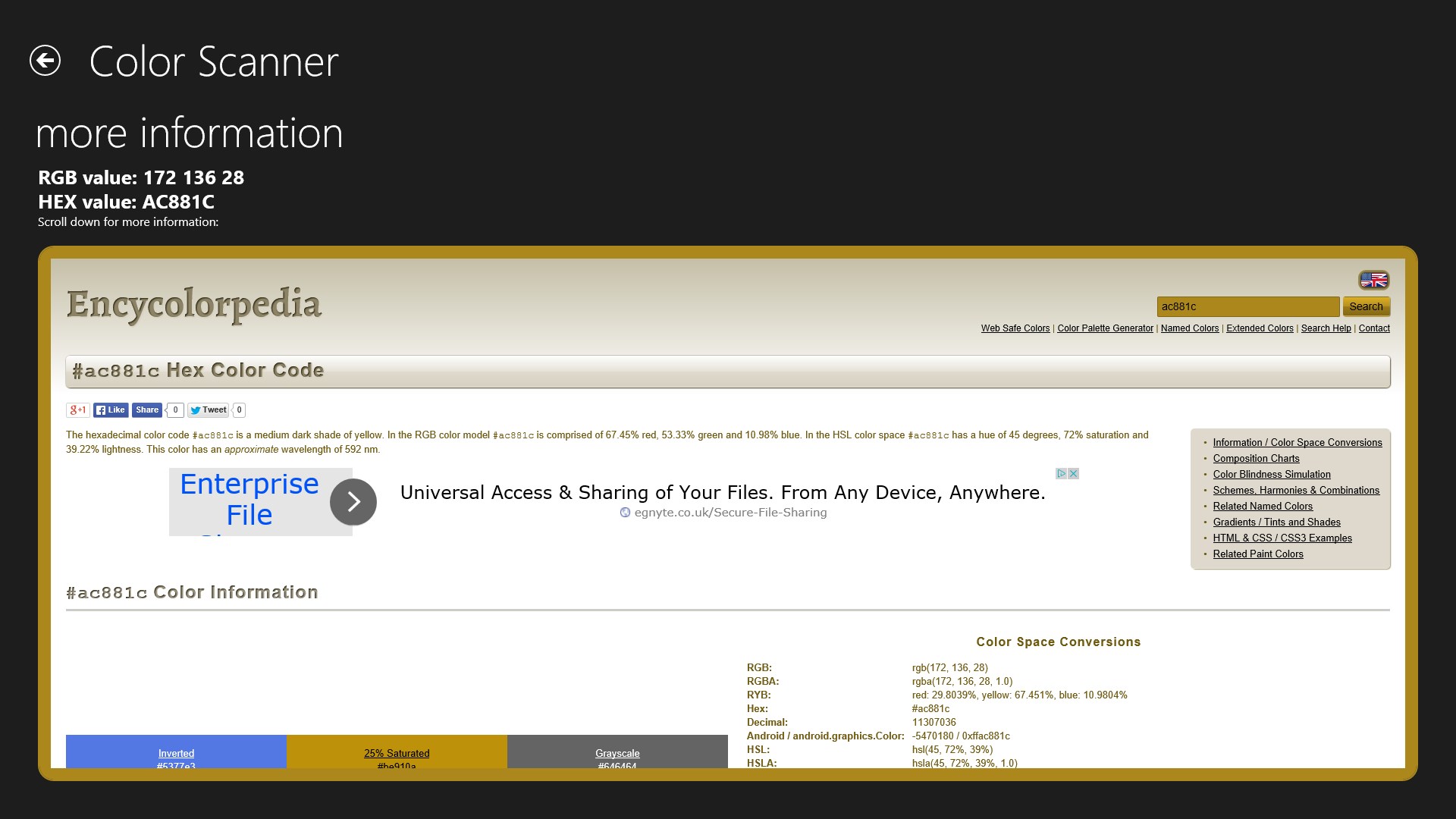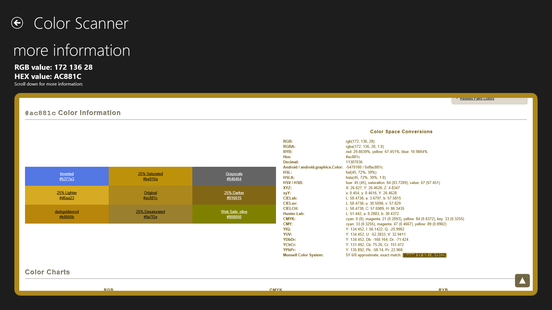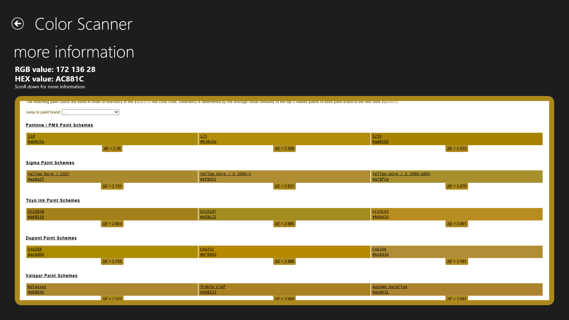 With this image you get a bunch of information about the color such as HEX and RGB value. And additional information like related named colors, paint numbers, color charts, auto color and much more. And save them aswell.
