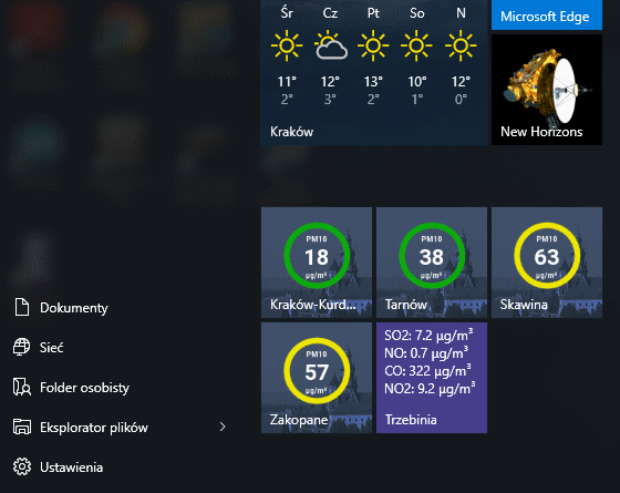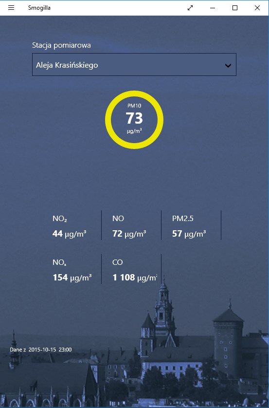 Uwaga: poszczególne stacje posiadają różny zestaw sensorów, dlatego zakres prezentowanych danych może być różny. Przykładowo stacja Kraków, Złoty Róg podaje wyłącznie poziom pyłów PM10.