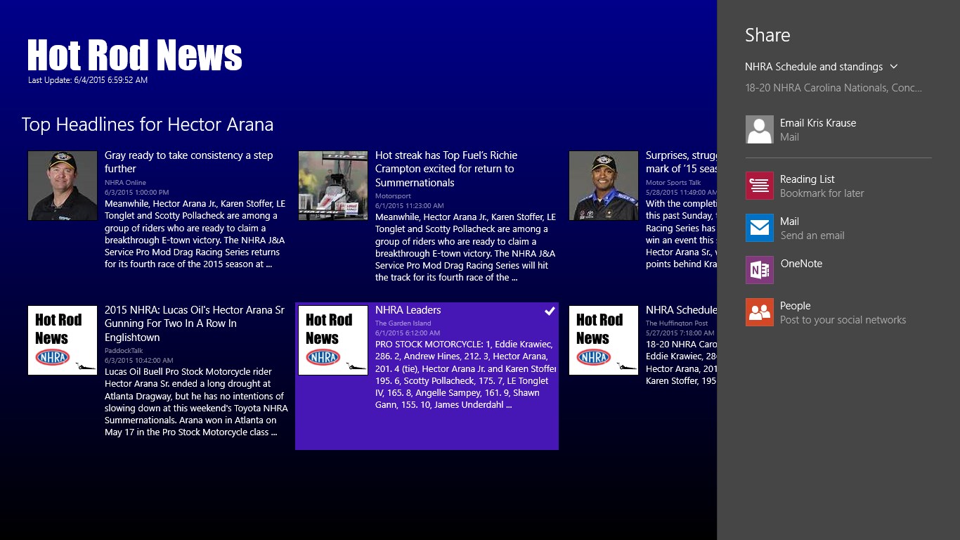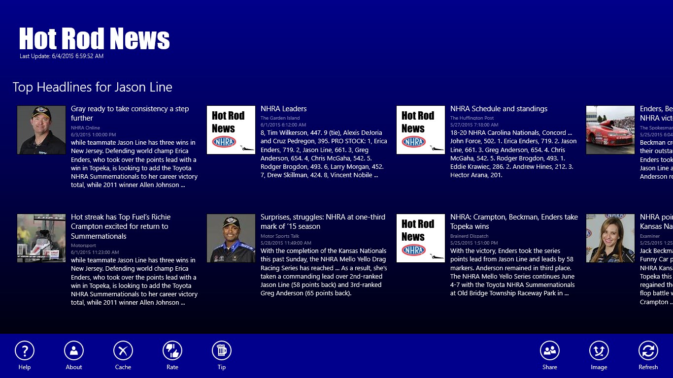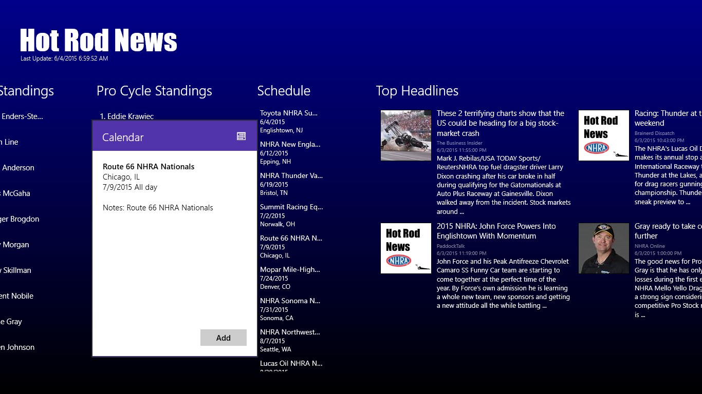 Top 50 most recent NHRA News HeadlinesCurrent Standings for the Top Fuel, Funny, Pro Stock, and Pro Stock MotorcycleEntire 2015 NHRA ScheduleEvery Driver with Every Driver News HeadlinesEvery Race with Every Race News HeadlinesLive Tile StandingsShare news articlesSnap view supportUpcoming race notificationCalendar integration for racesNo ads. In-app purchase to send a tip - Support solo developers