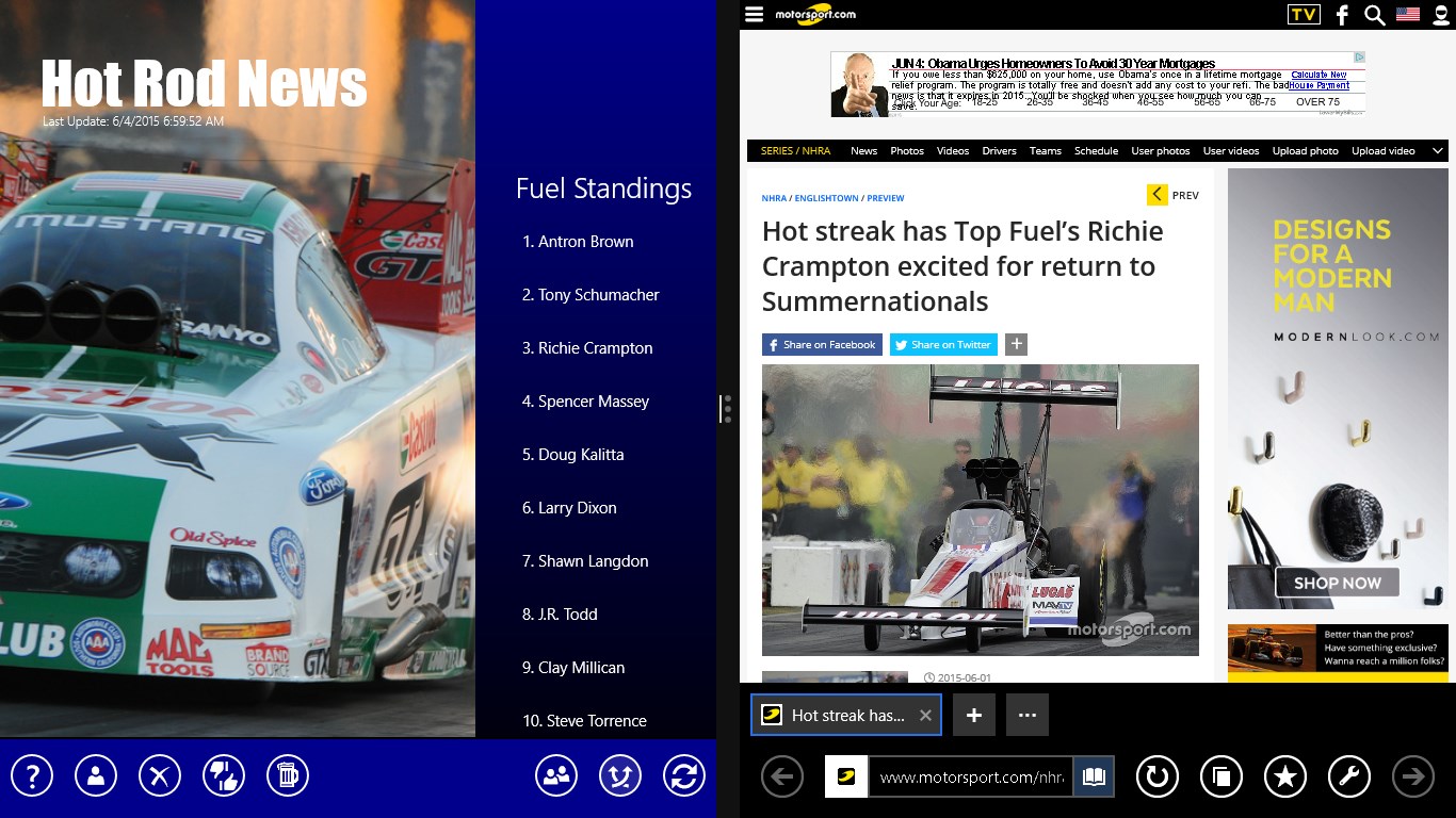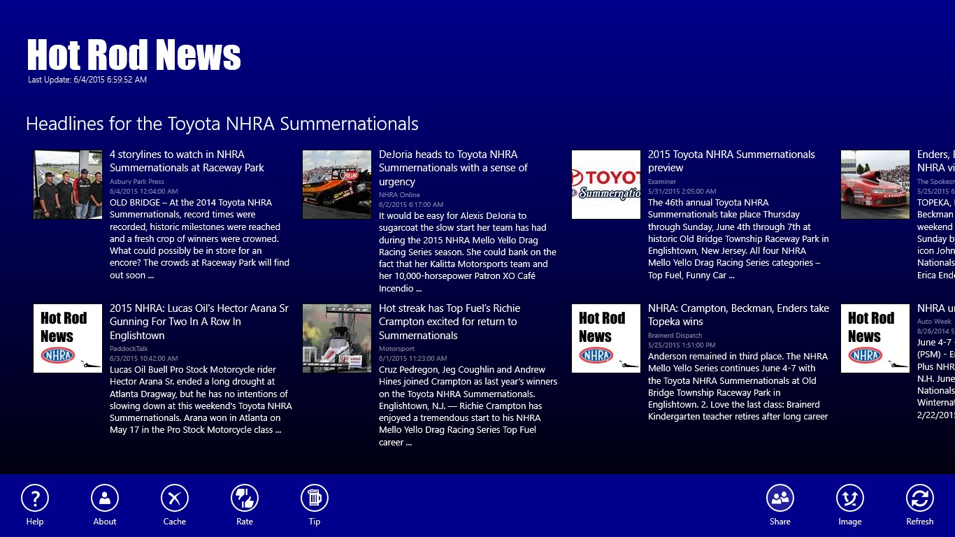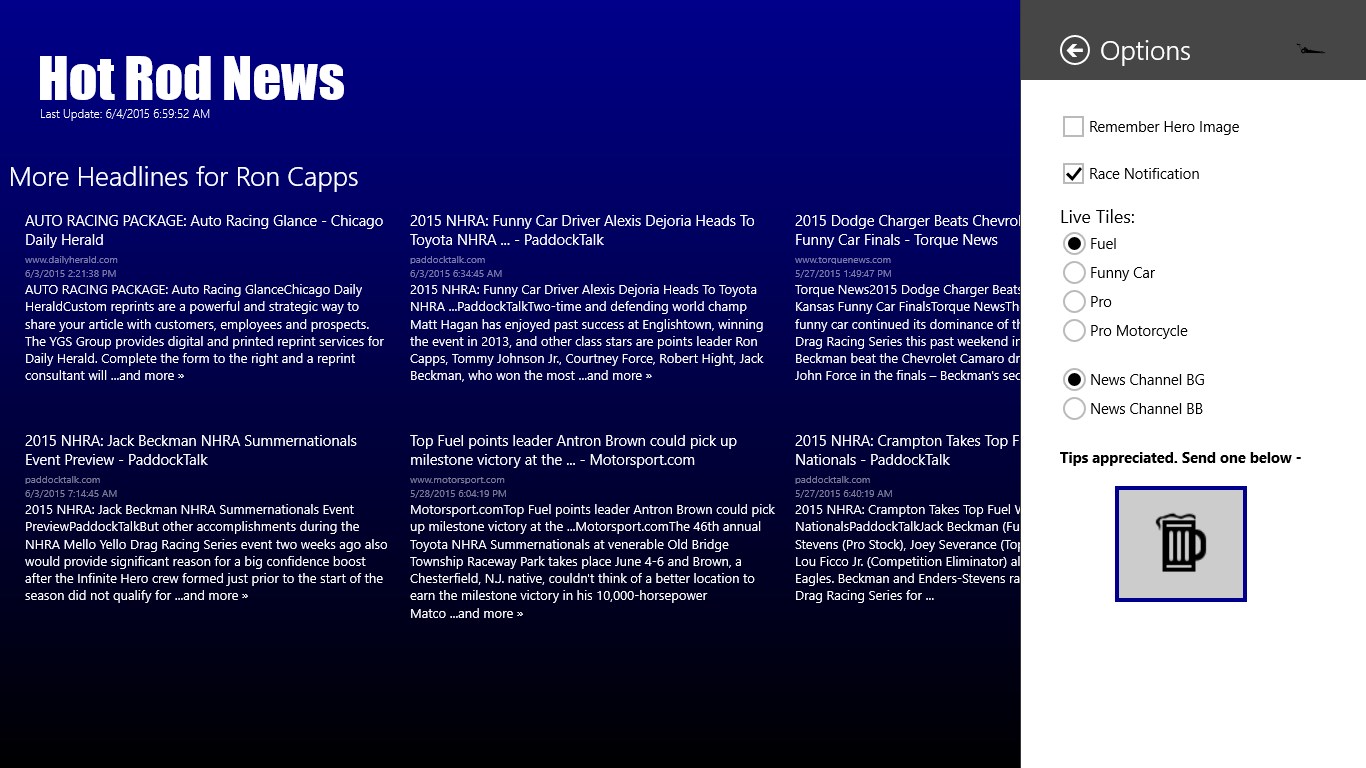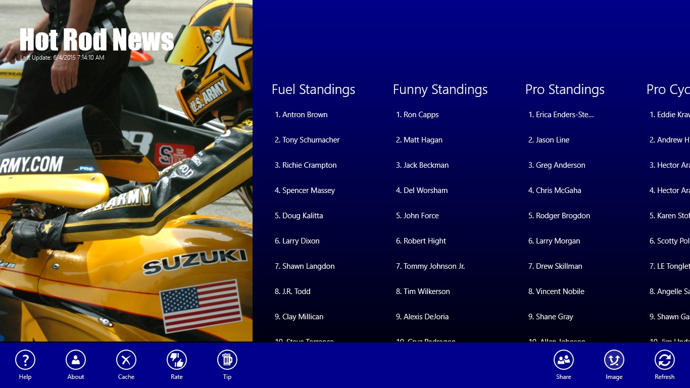Top 50 most recent NHRA News HeadlinesCurrent Standings for the Top Fuel, Funny, Pro Stock, and Pro Stock MotorcycleEntire 2015 NHRA ScheduleEvery Driver with Every Driver News HeadlinesEvery Race with Every Race News HeadlinesLive Tile StandingsShare news articlesSnap view supportUpcoming race notificationCalendar integration for racesNo ads. In-app purchase to send a tip - Support solo developers
