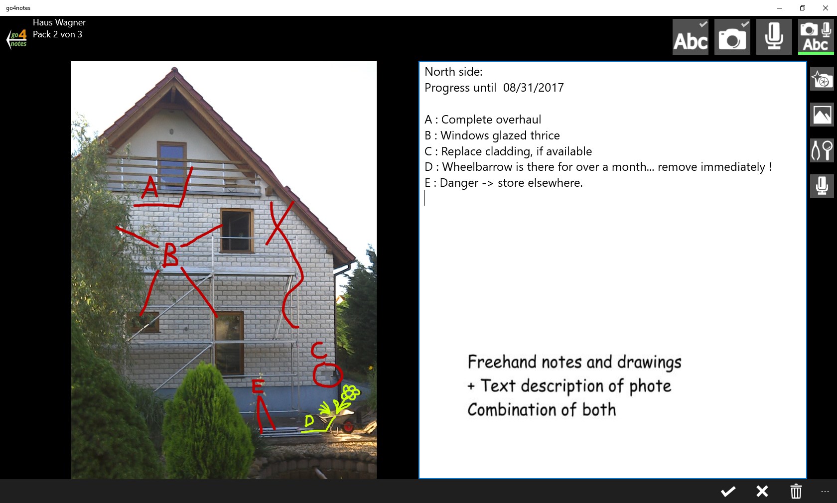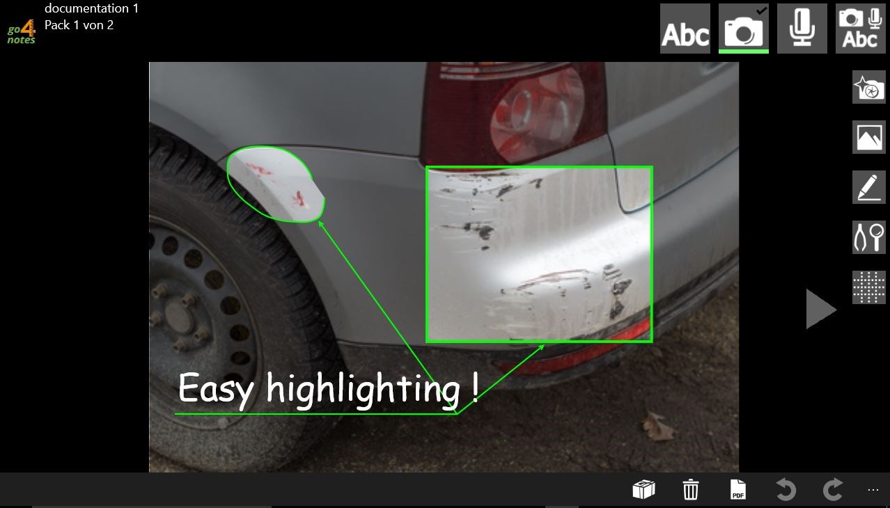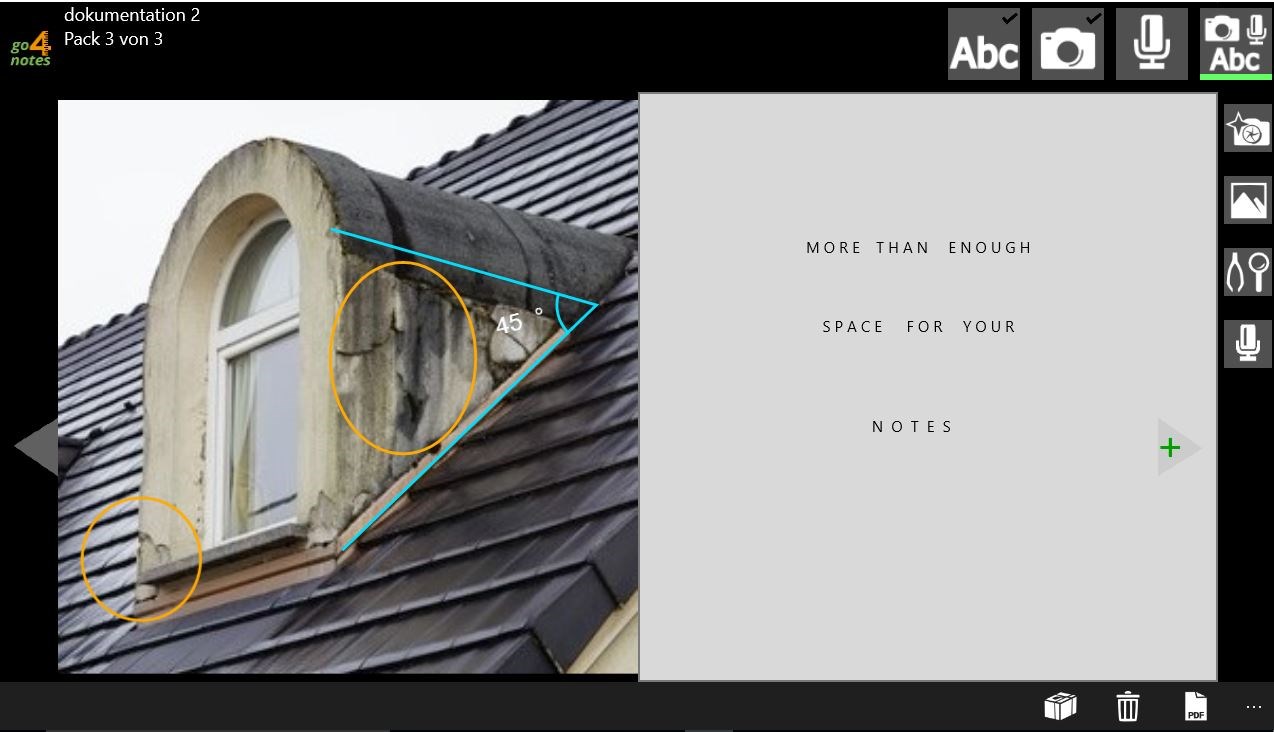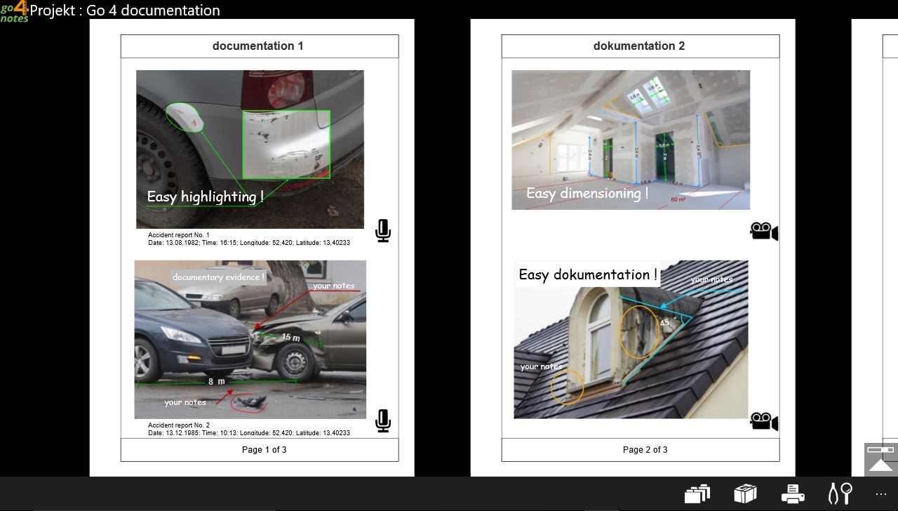 With GO4NOTES you can create, comment and organise photos, notes, and recordings, manage and assemble them in project files and share them - on the go or at home – also as a PDF file.