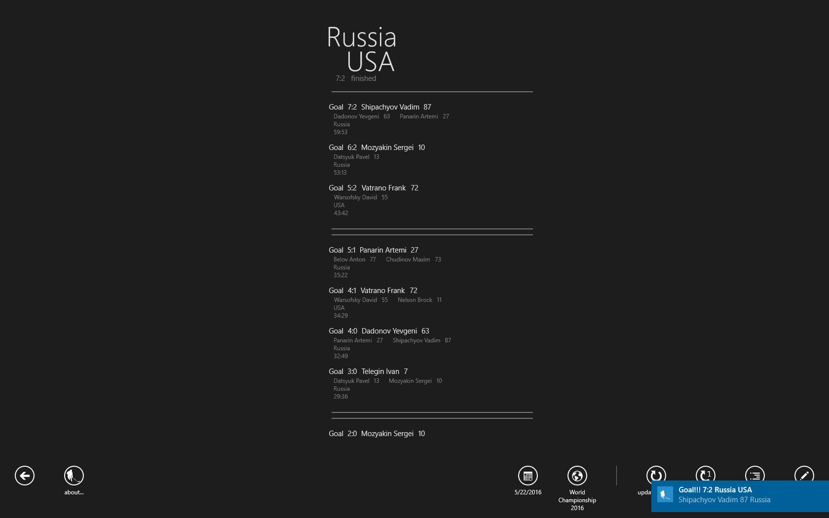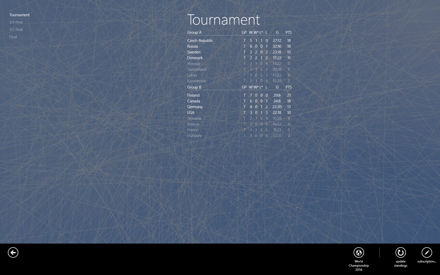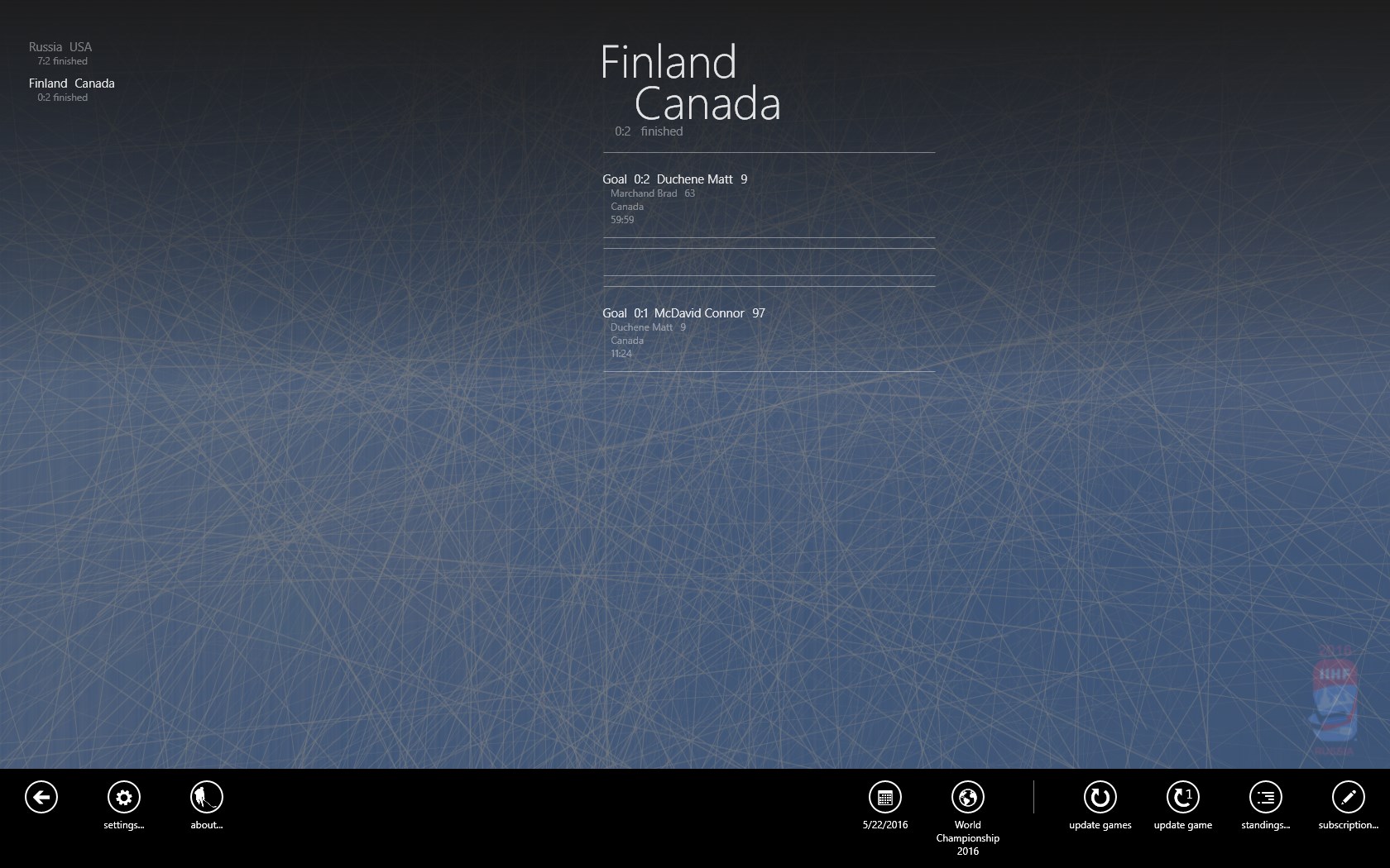 ** note: Notices of goals, periods/breaks, beginnings/ends of the games and also of games results and position changes of the teams are at the moment supported.