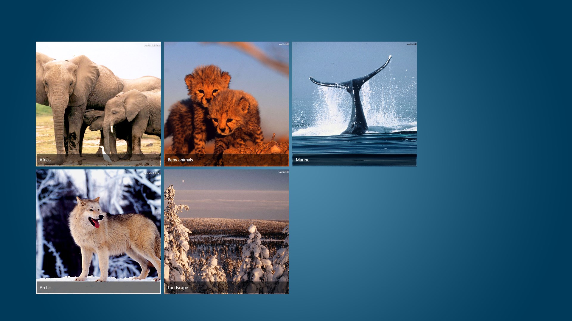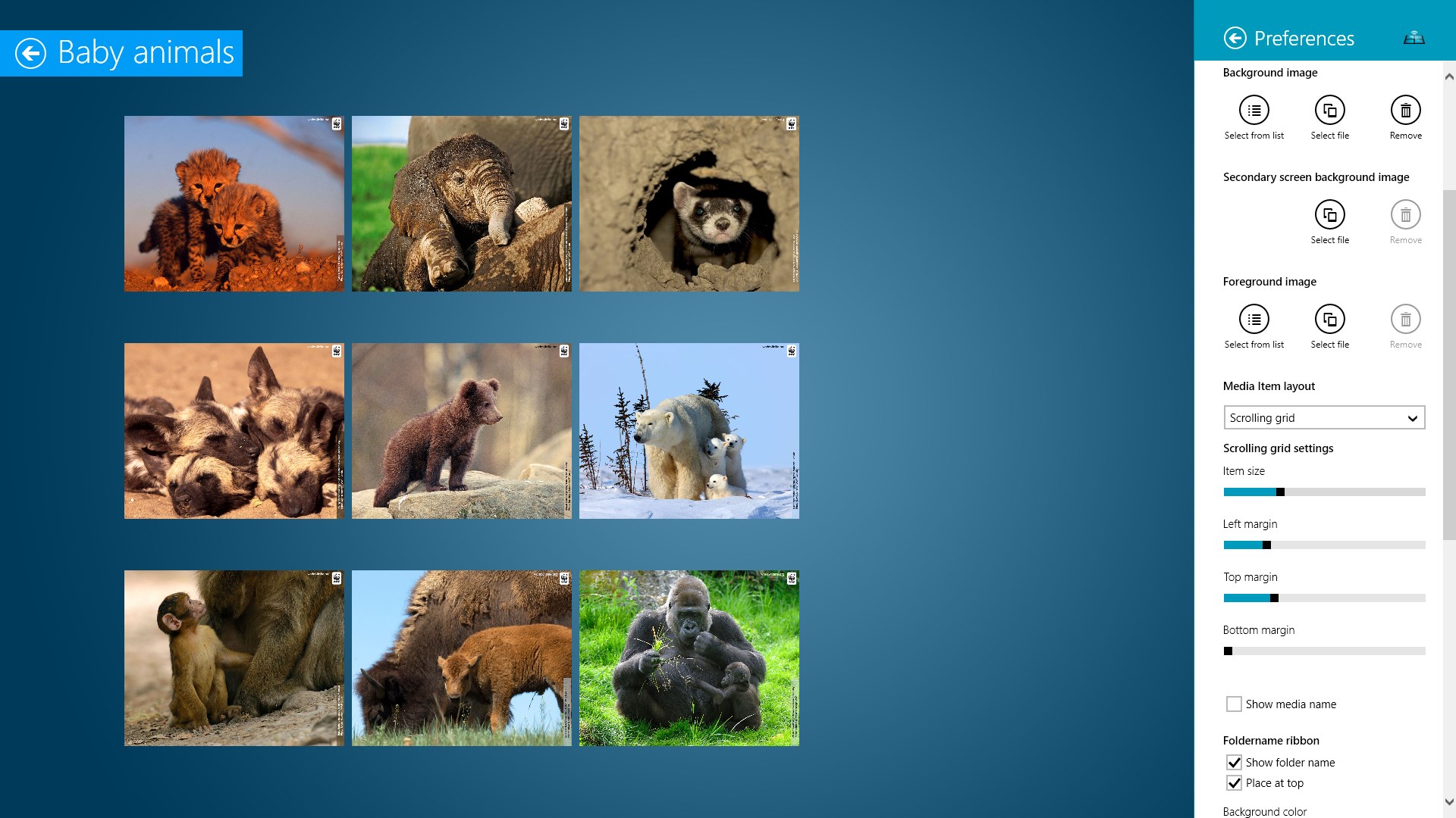 Content management is as simple as setting up a collection of images and videos stored in folders. Folders will be shown as live tiles that can be navigated to. You can quickly switch between different portfolios by configuring a different media root folder in Media Kiosk. Content can be managed from a remote location by using a Skydrive folder as media root folder.