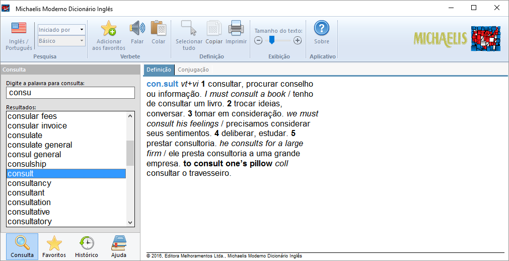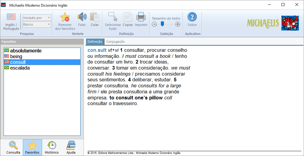Com mais de 330.000 traduções, este é o mais completo dicionário "offline" bilíngue de inglês e português. Elaborado com rigor científico e lexicográfico, o "Michaelis Moderno Dicionário Inglês" está atualizado com neologismos e os mais novos termos técnicos de áreas como Informática, Economia, Marketing, Artes, Comunicação, Ciências, Tecnologia etc.