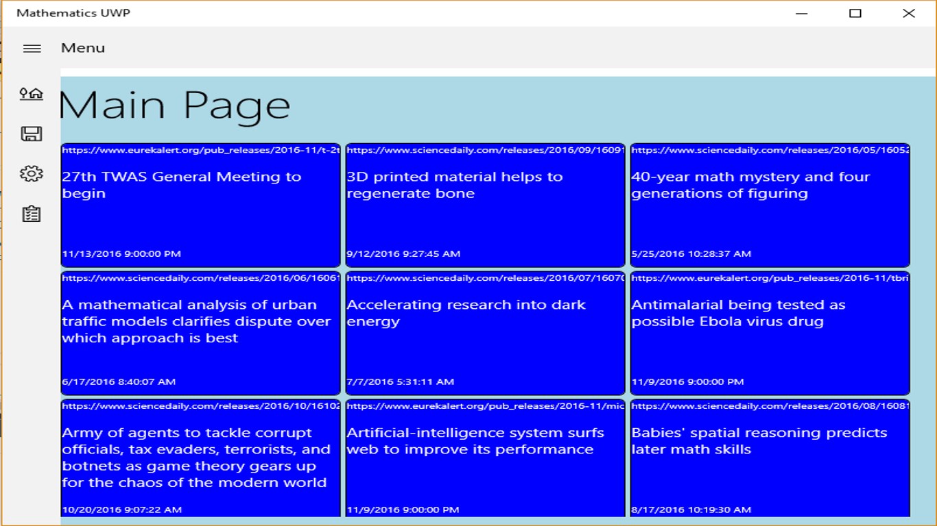 Mathematics UWP is a Windows 10 targeted news application that provides the user with the ability to monitor what’s happening in the world of home beer brewing. It comes with 5 pre-selected RSS site, and allows the user to change these and or add up to 5 more sites. The application also provides the means to save interesting links, for future review.
