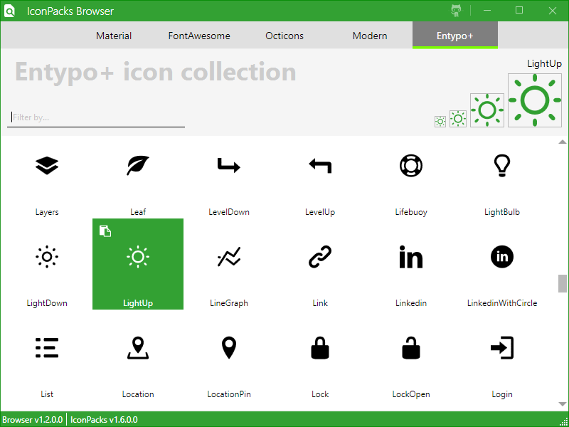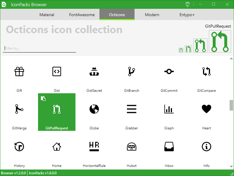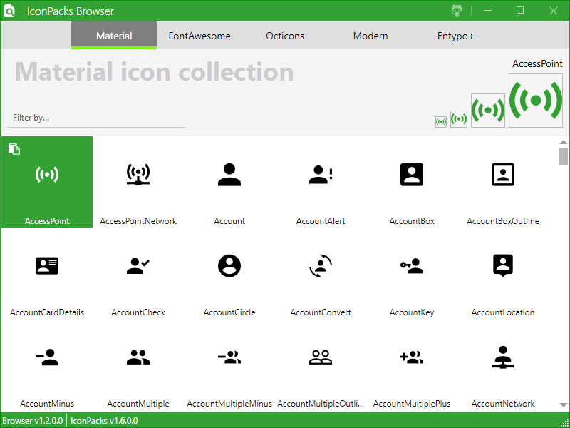 If you have no idea which icon you're supposed to take, then you can use the IconPacks Browser. You can search in every IconPacks and copy a raw Xaml code snippet to the clipboard.