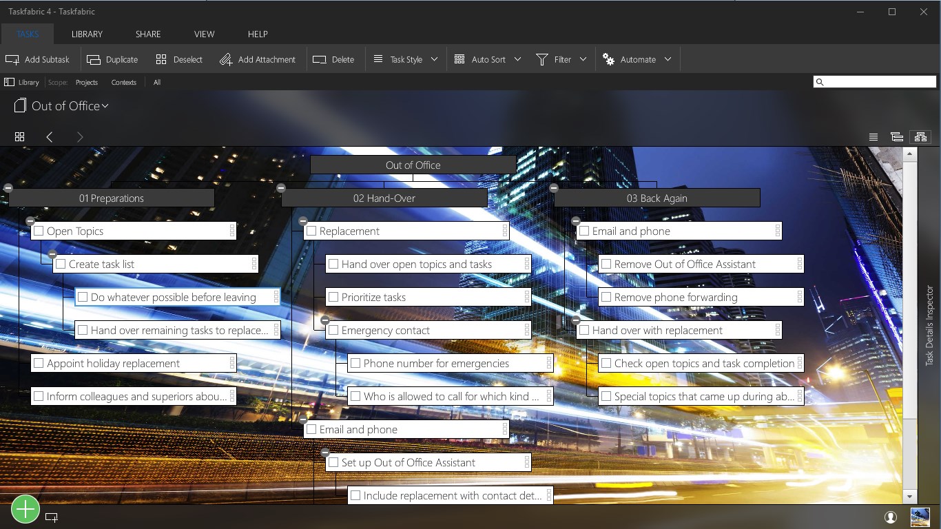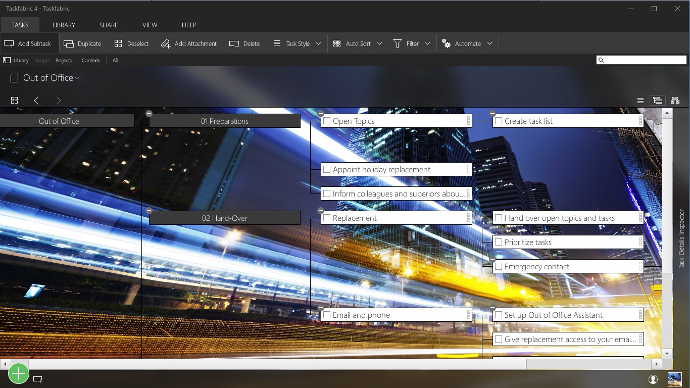 With Taskfabric you can add a formatted note, file attachments and web links to each task to keep everything you need for your tasks in one place. Modern project management standards, like GTD (Getting Things Done), contexts, AID and RACI, are fully supported.