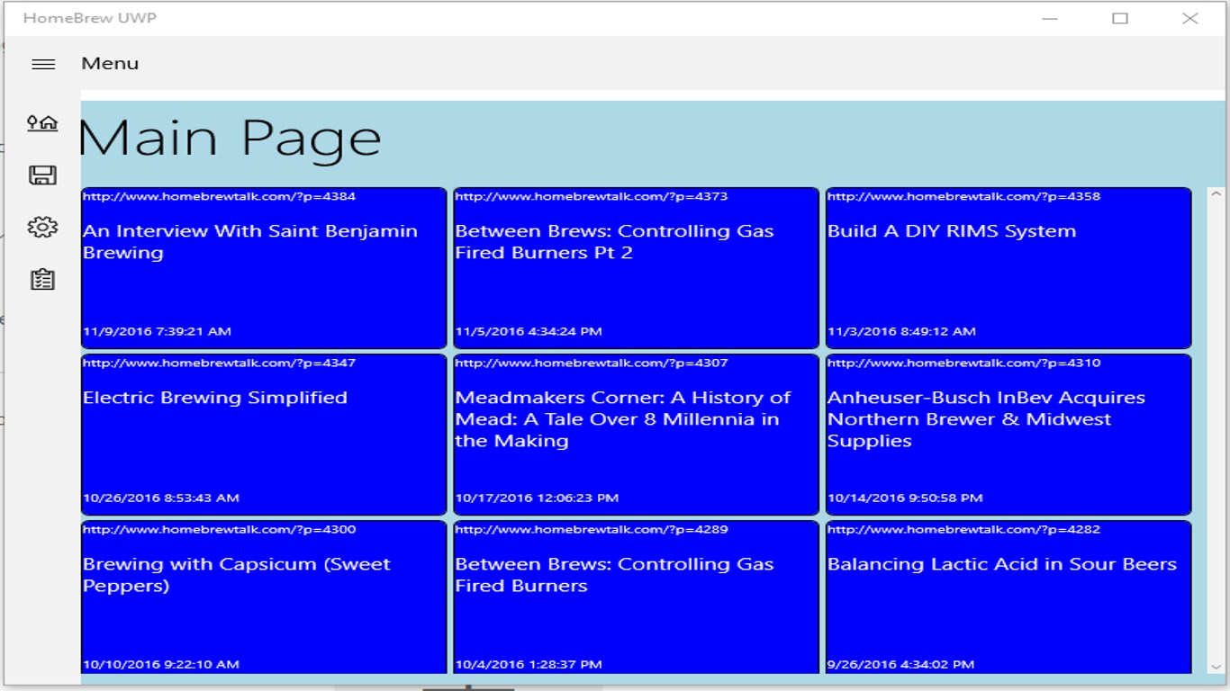 Homebrew UWP is a Windows 10 targeted news application that provides the user with the ability to monitor what’s happening in the world of home beer brewing. It comes with 5 pre-selected RSS site, and allows the user to change these and or add up to 5 more sites. The application also provides the means to save interesting links, for future review.