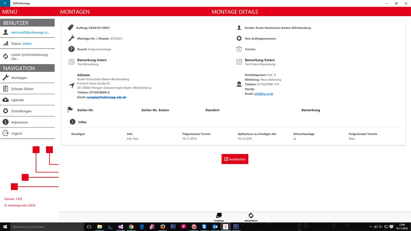 - Alle Daten zum Montageeinsatz auf einen Blick (Kunde, Ansprechpartner, Auftrag, Klassifizierungen, Vorgänge, uvm.)