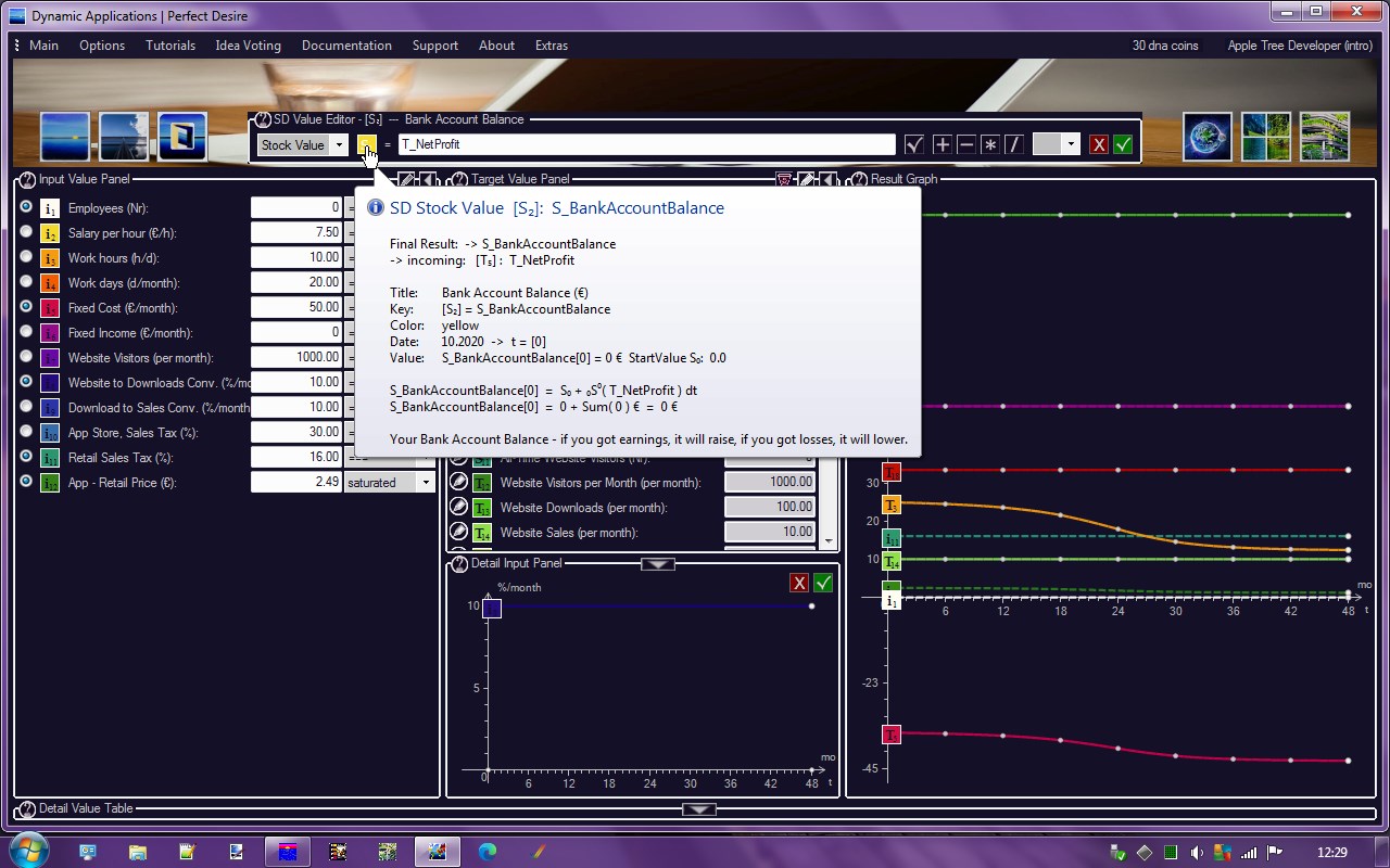 Apple Tree Calculation - Revenue, Cost and Net Profit over TimeBakery Tutorial - manage a small Bakery, baking breada Multi-Material Tool CalculatorThe Water Supply - Well Builder Simulation Modela freely configurable Time Ruler in 10..240 days/months/years.Dynamic Idea and Roadmap Competition (free Twitter account required to vote)Apple Tree is the Spring 2019 winner of the Dynamic Idea competition.All calculation models are fully Transparent via automated ToolTips.no Data gathering, no Adware, no Spyware, no Server behind you. It\'s your Business. We respect that.