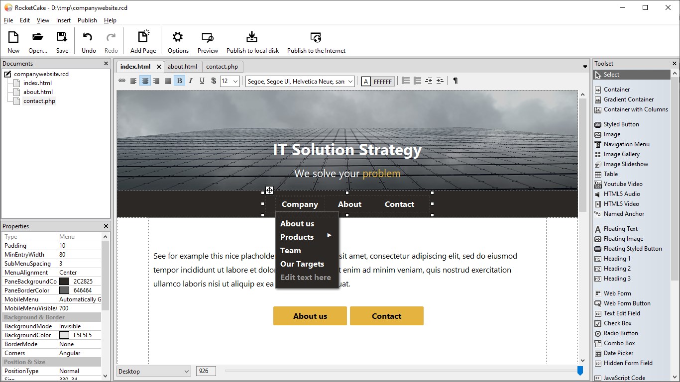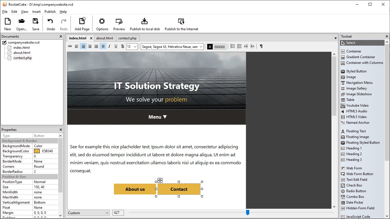 RocketCake is a website designer for creating responsive websites, for beginners and professional web developers. No programming needed.