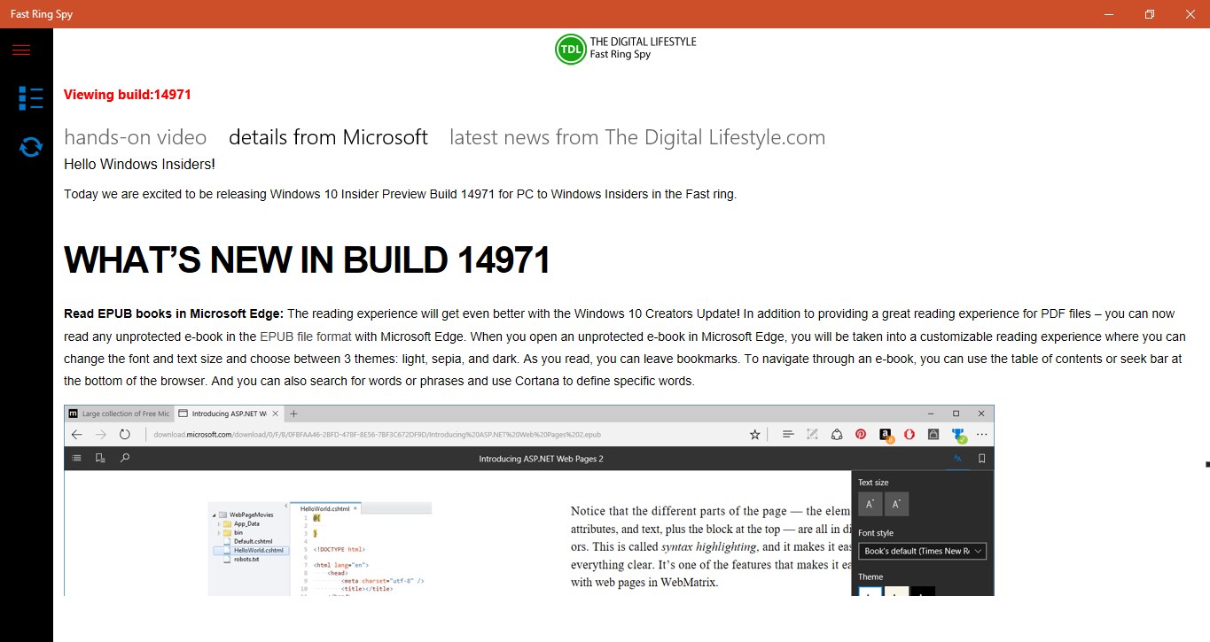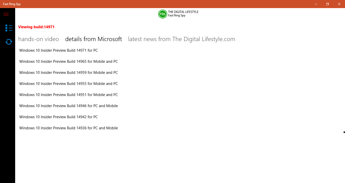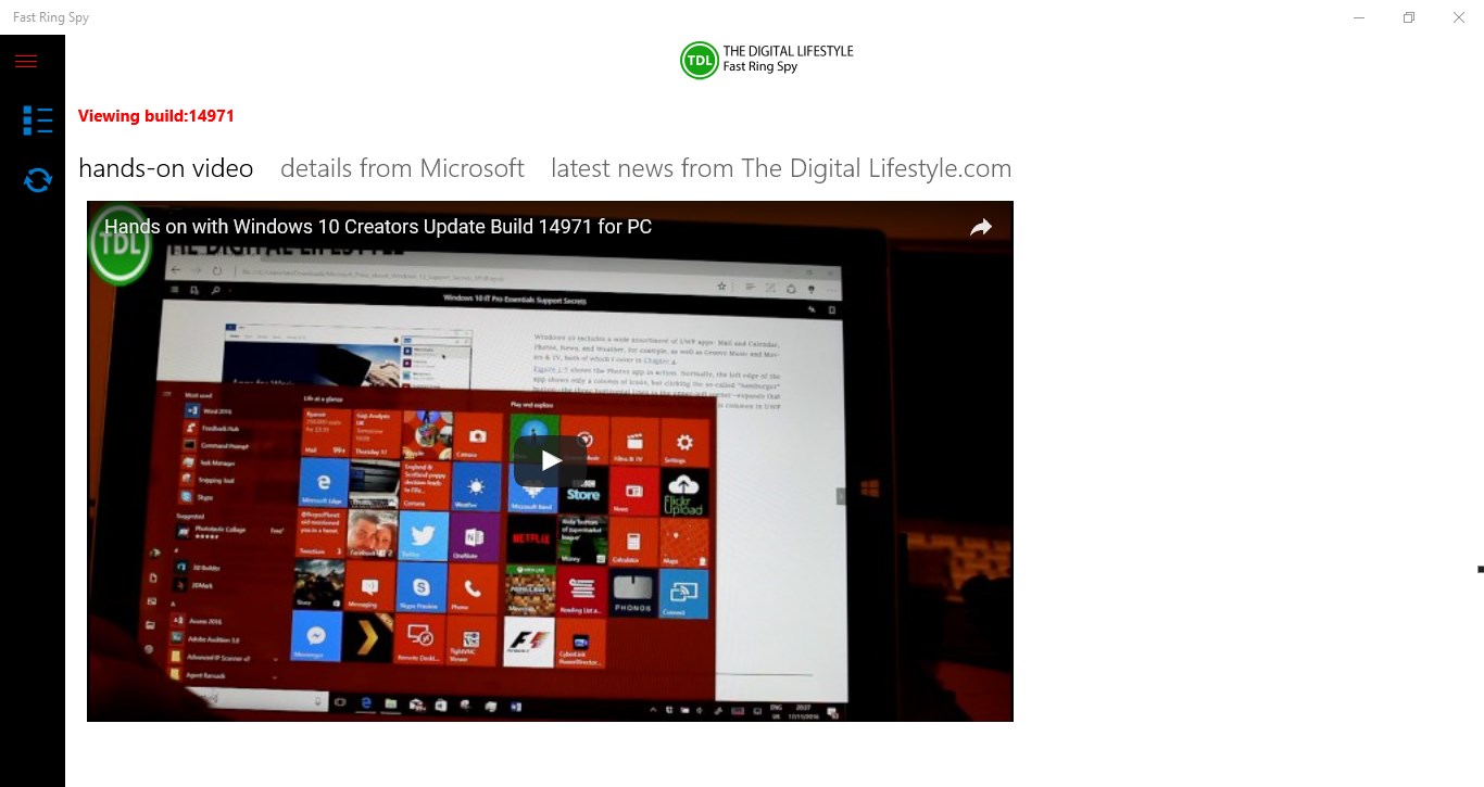 Get the latest information Windows 10 information with Fast Ring Spy. The app gets the latest Windows 10 Fast Ring build details from Microsoft and the latest hands on video from The Digital Lifestyle.com. Stay up to date with the latest Windows 10 build information. Get an alert when a new Windows 10 build is released to the fast ring.