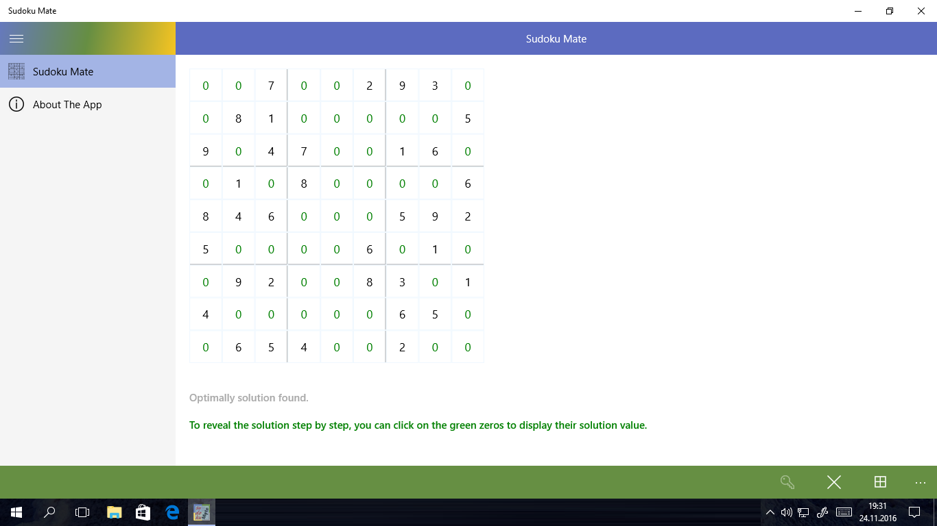 You love to solve Sudoku puzzles. But at some point even a master sometimes just gets stuck. With Sudoku Mate the anger has come to an end. Just enter the starting values of the Sudoku puzzle and let the app calculate the solution. You don't have to miss the fun of a self worked out solution, because you can display the solution step by step. Because sometimes only the next number is missing, in order to get the complete puzzle solved. Depending on the difficulty of the puzzle, the calculation can take several minutes. So don't get nervous and wait patiently.