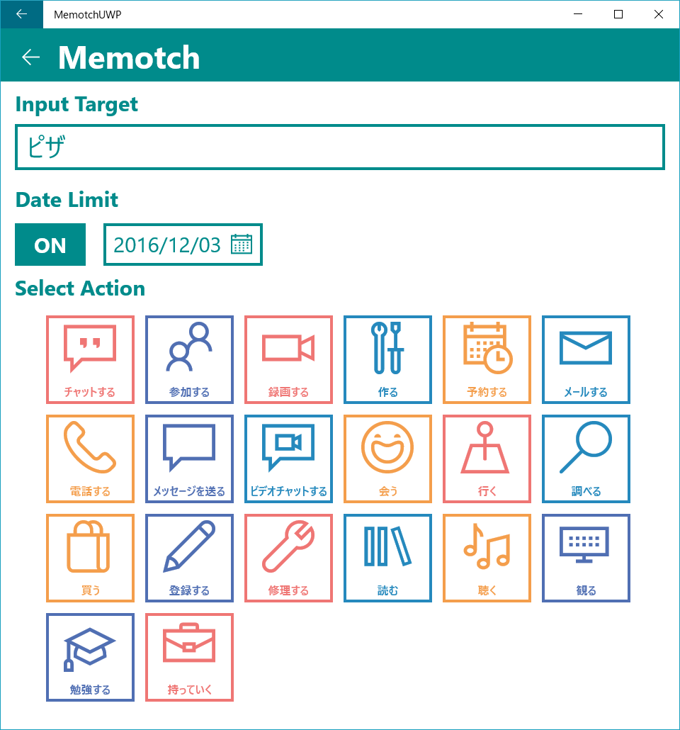 例えばInput Targetに「牛乳」と入力してSelect Actionで「買う」のタイルを選択するだけでリストに「牛乳を買う」というメモが追加されます。