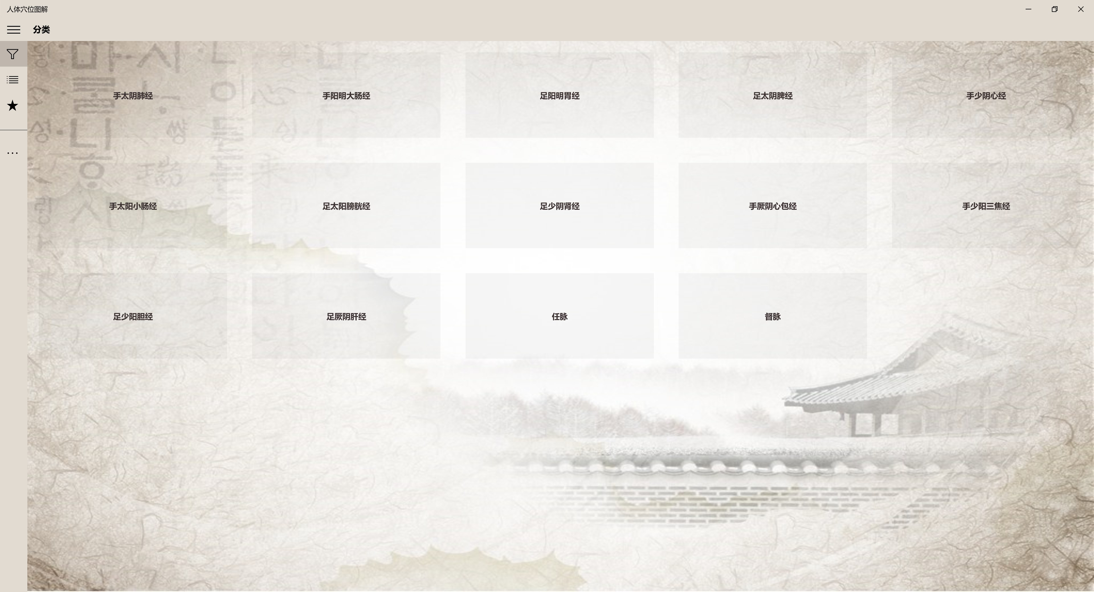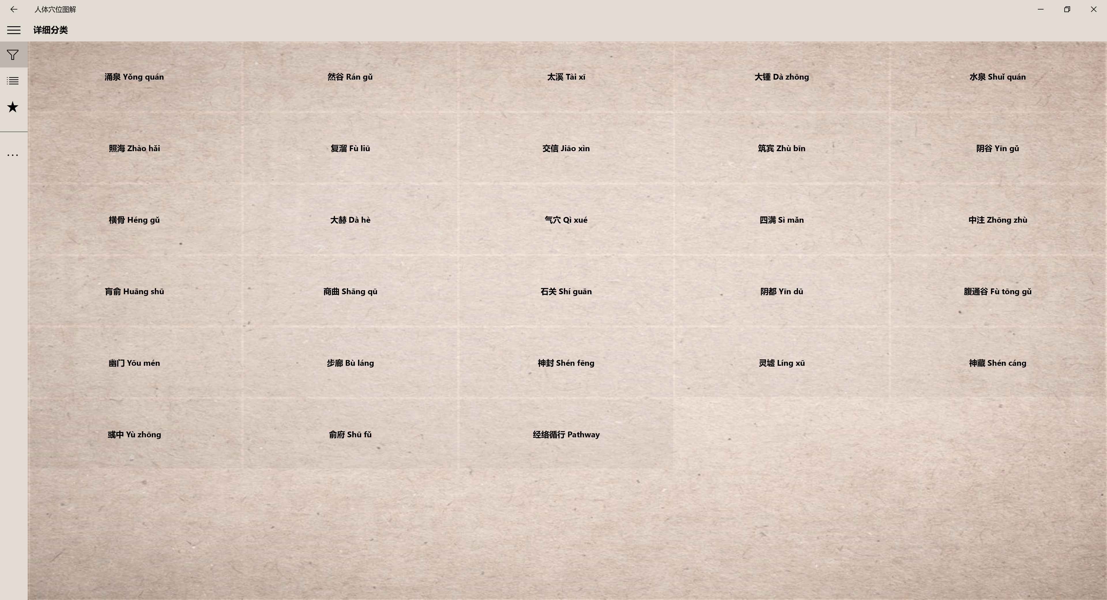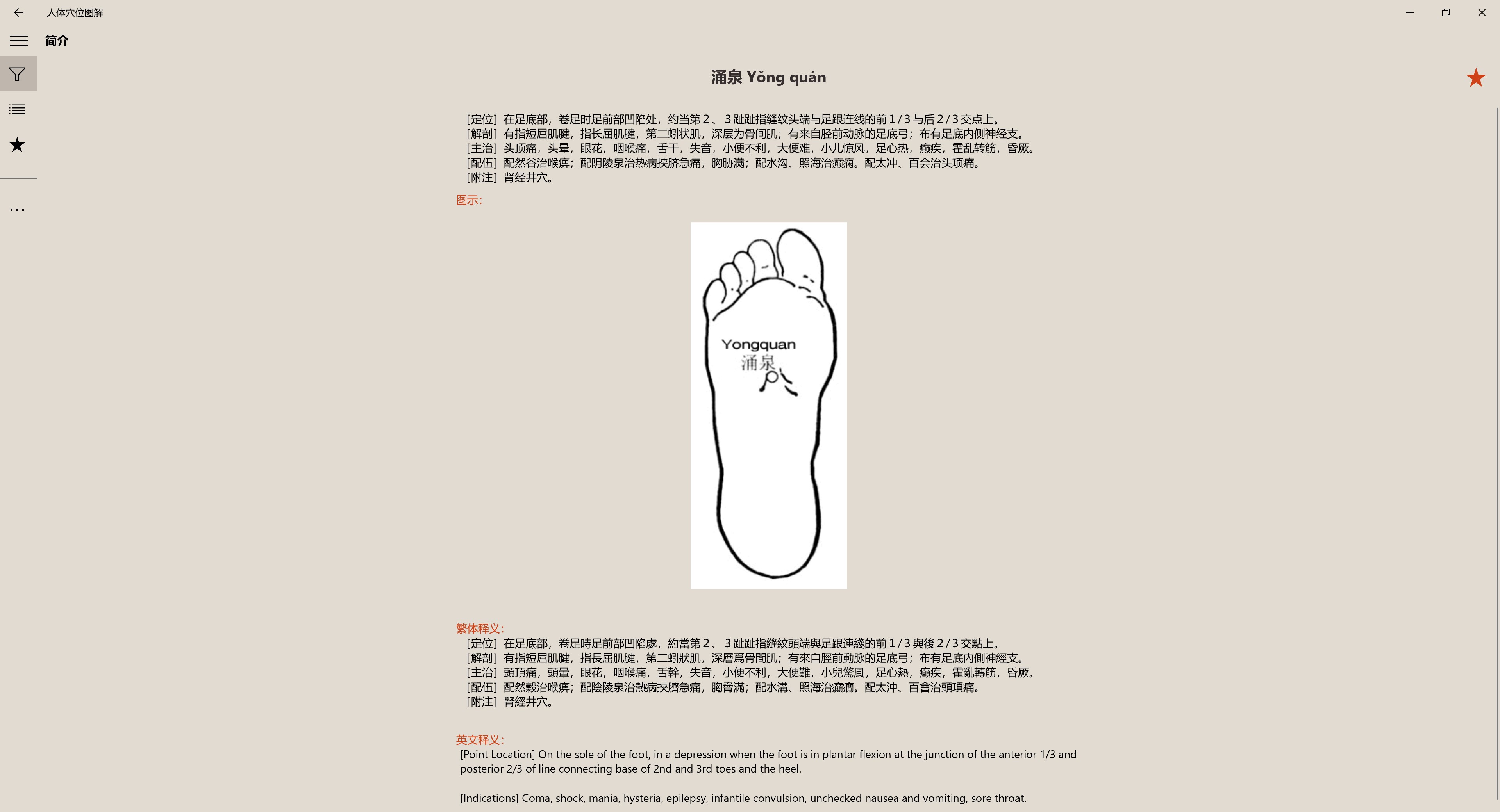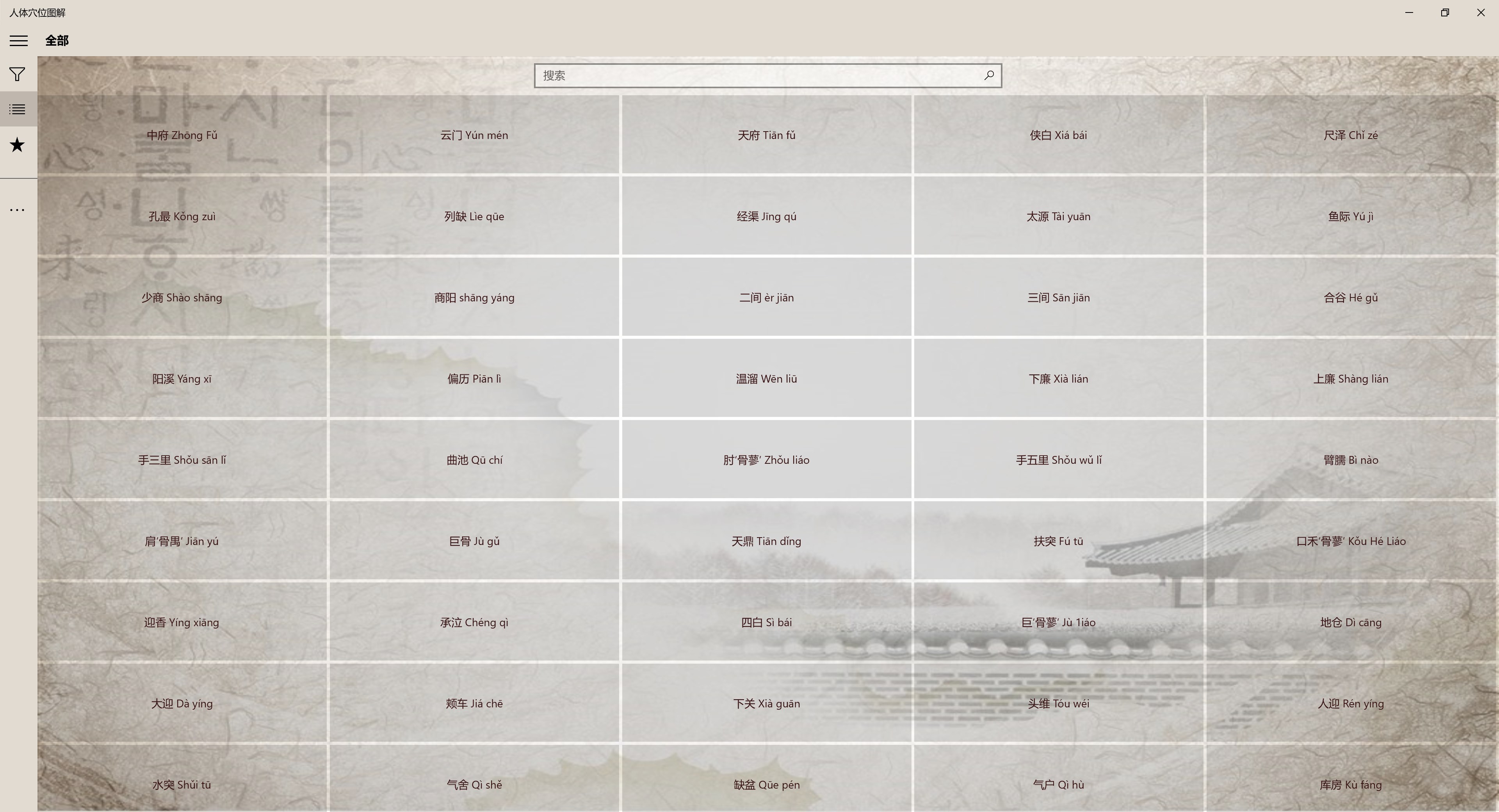 人体穴位图解,一款为用户提供快速查找经络,穴位的功能的win10通用UWP应用。支持电脑平板手机,一次使用多处运行。400多个常用穴位能够快速找到。
