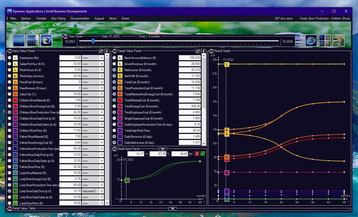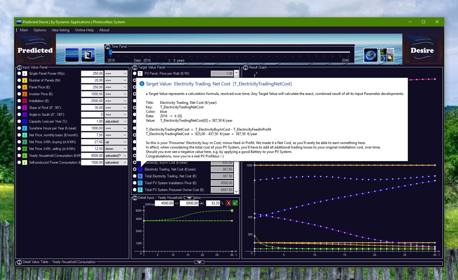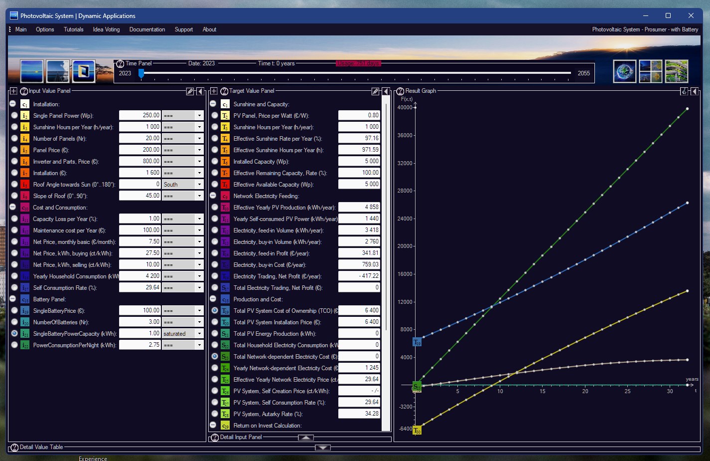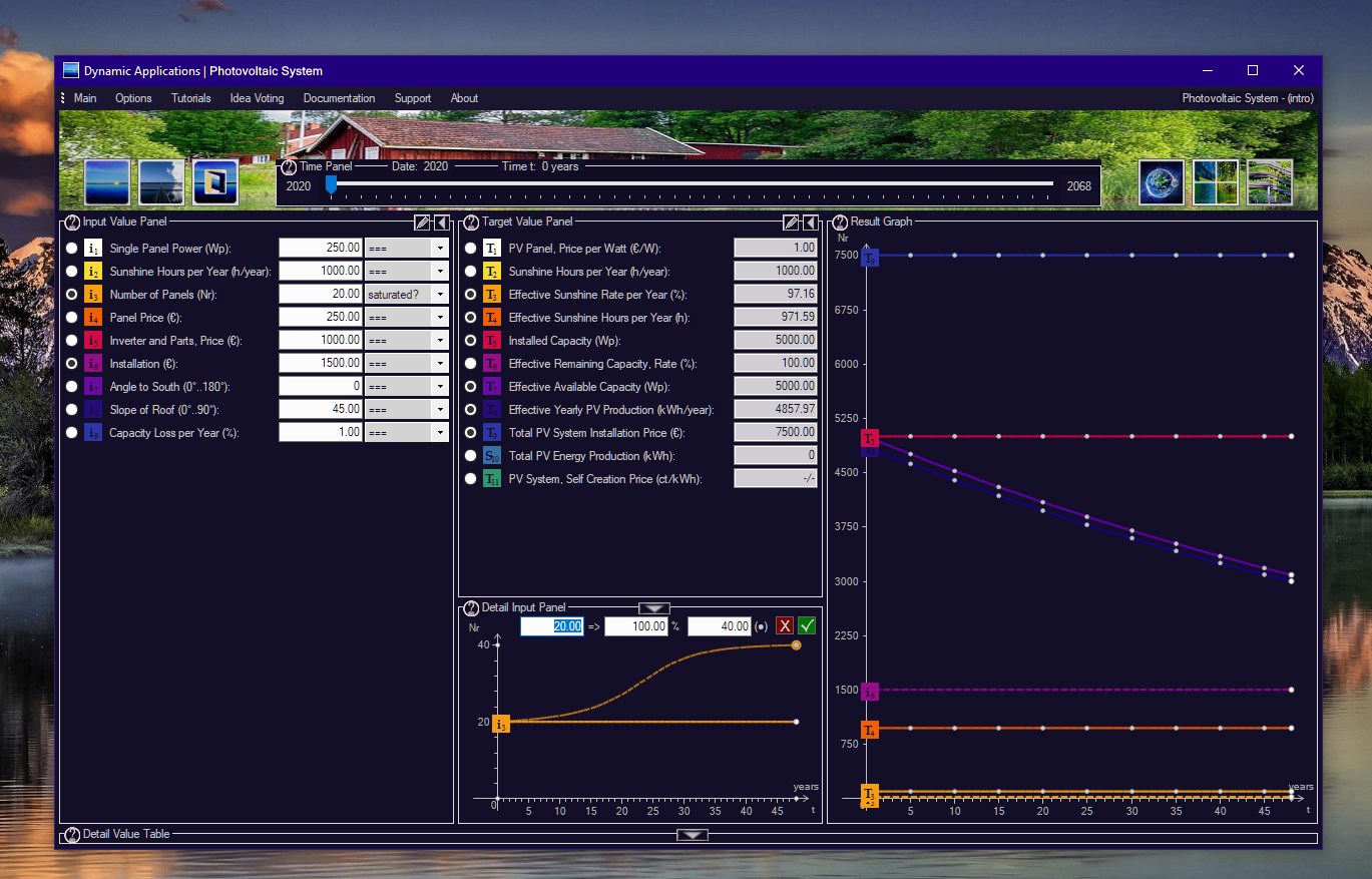 Photovoltaic System is a Net Profit and Amortization Calculator, including a Prosumer Network Trading simulation.Find your sweet spot. This software is all about determination of the right number of PV Panels for your own house.Net Profit, Total Cost, Total Cost including Prosumer Network Trading. Total Amortization.Live adjustment of typical Input Parameters:PV Panel Capacity, Number of Panels, Installator Price, Network Electricity Pricing, Household consumption.No Data Gathering. No Ads. No Spyware. No Webserver behind. This is your life, not ours.The concept behind is a Differential Equation Solver, able to solve your parametrization locally at runtime.Based on System Dynamics, the world\'s most popular prediction method. Invented at MIT in Massachusetts.New - Photovoltaic System v7.84 - Prosumer with Battery Simulation