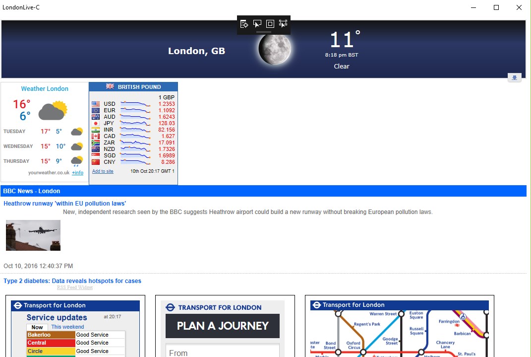 Live Information about London. It includes current weather, Currency Exchange Rates, BBC London news, TFL underground status, Journey Planner.