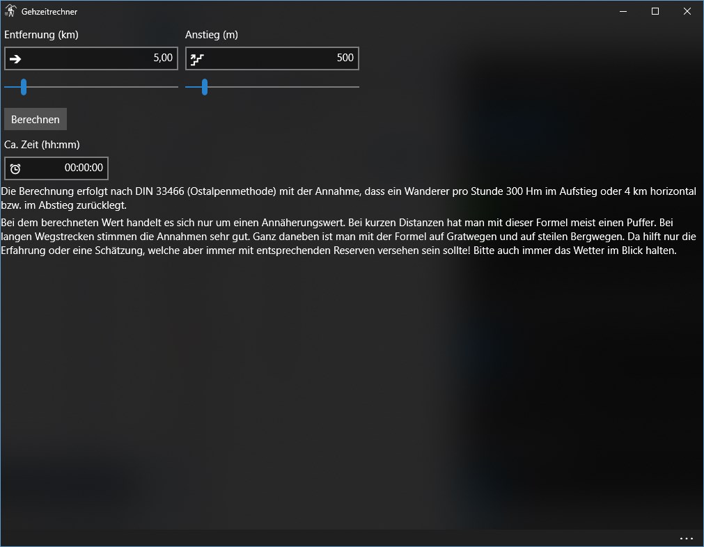 Diese App implementiert die Berechnung nach DIN 33466 (Ostalpenmethode). Damit kann man einfach selber nachschauen wie lange eine Wanderung ungefähr dauert.