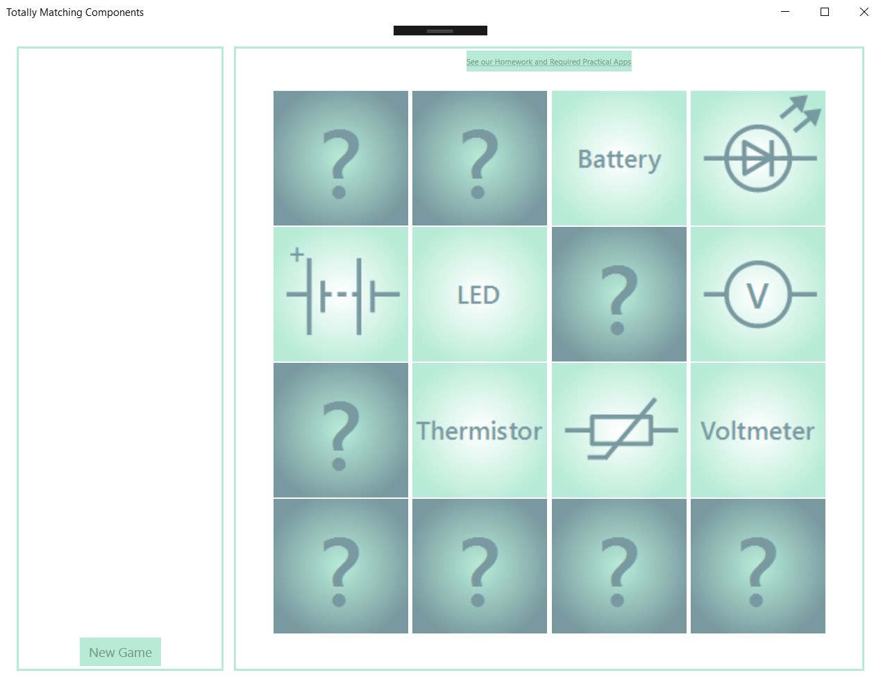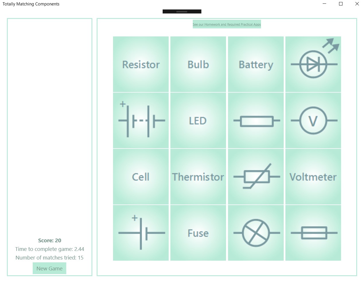 When you have matched all the components, you are given a score based on how quickly you found the pairs and how many mistakes you made.