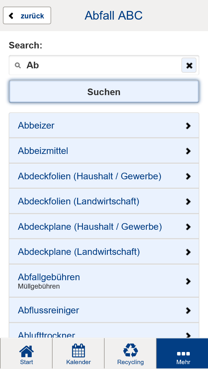 * Annahmestellen für Abfälle aller Art mit Ortsangabe und Öffnungszeiten, inkl. Kartenansicht und Navigation.
