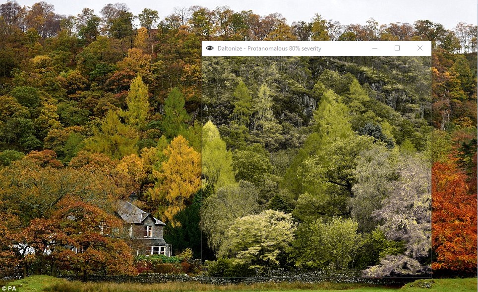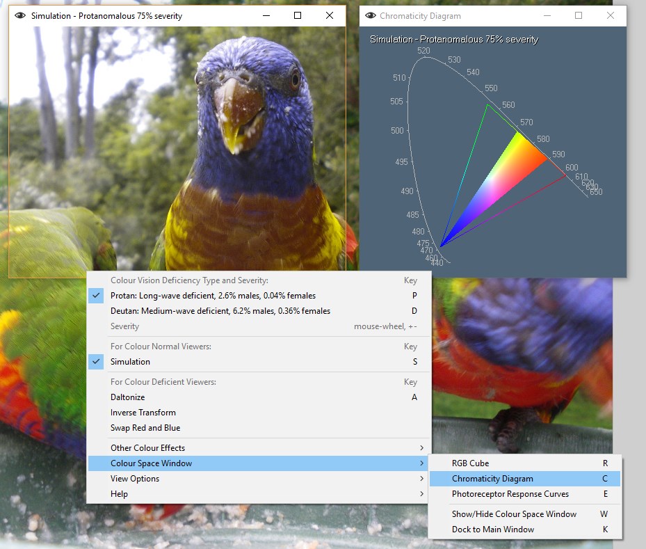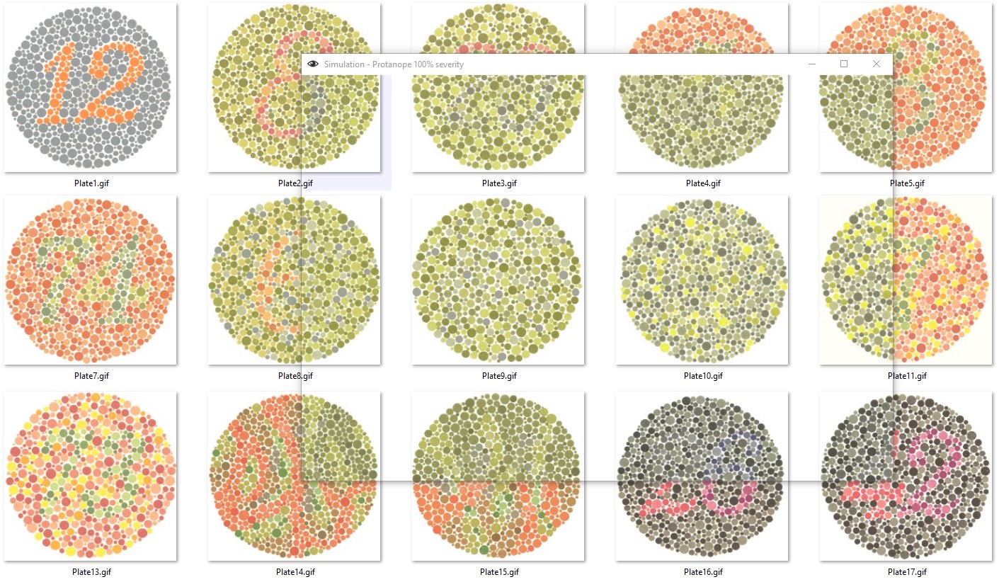 The application provides real-time simulation of the common forms of inherited red-green colour-blindness.