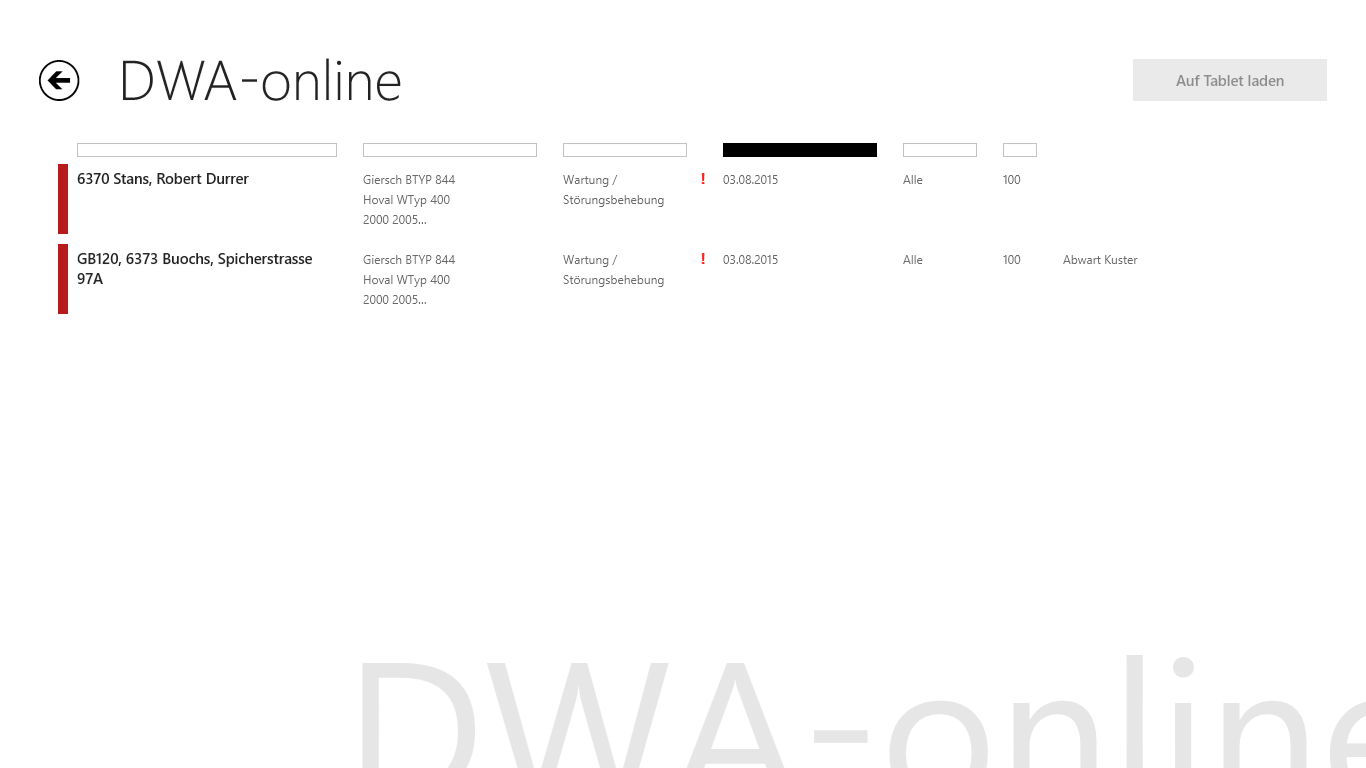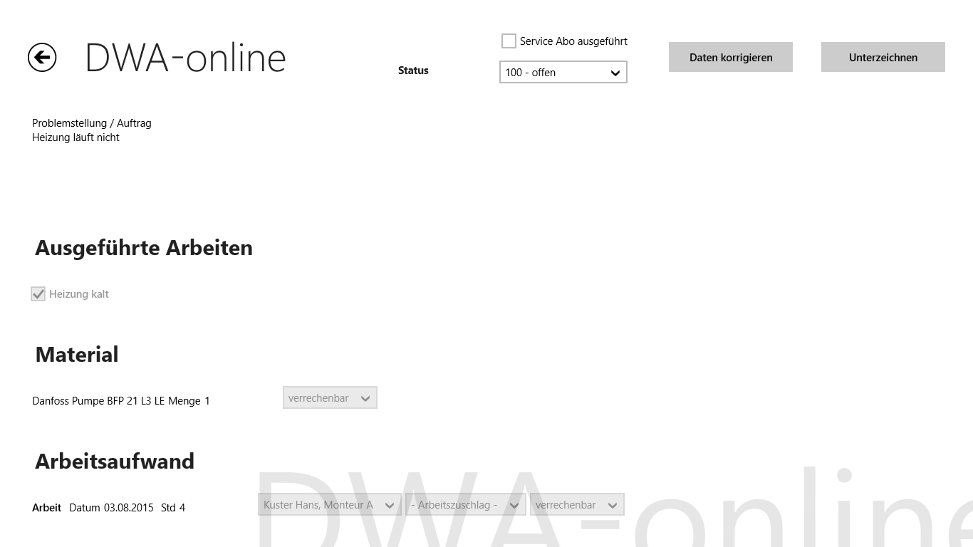 Laden Sie den gewünschten Rapport auf Ihr Tablet und füllen Sie dann vor Ort, auch ohne Zugang zum Internet, den zugehörigen Rapport aus. Die Rapporte können auf dem Tablet vom Kunden unterschrieben werden.