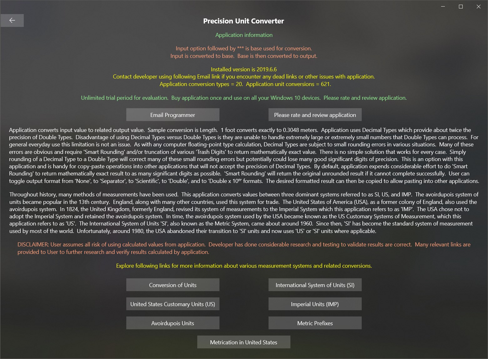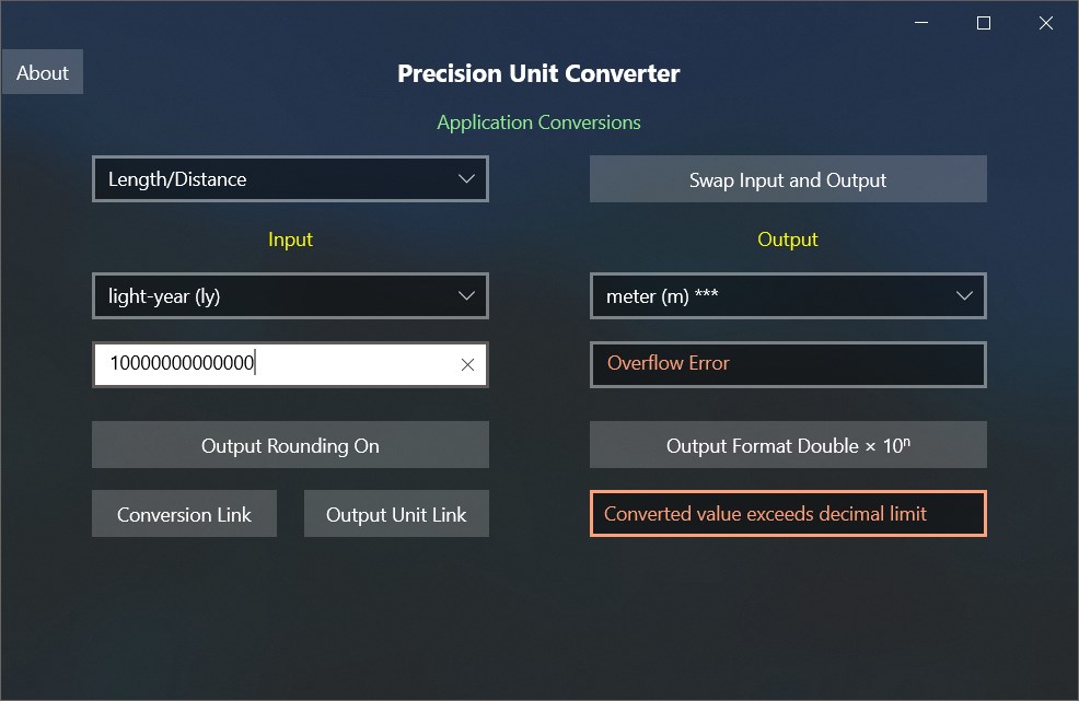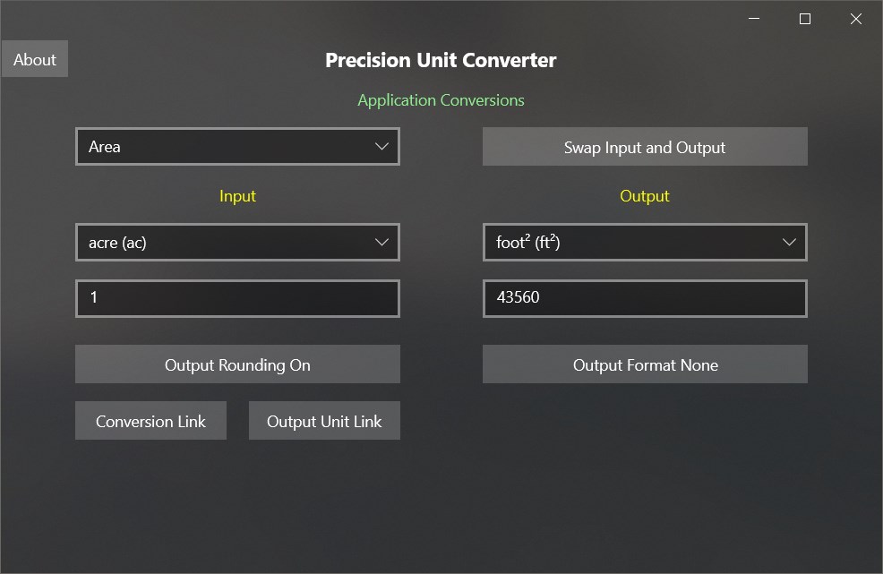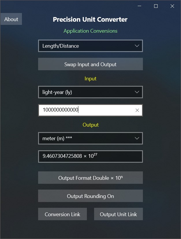 Application converts input value to related output value. Sample conversion is Length. 1 foot converts exactly to 0.3048 meters. Application uses Decimal Types which provide about twice the precision of Double Types. Disadvantage of using Decimal Types versus Double Types is they are unable to handle extremely large or extremely small numbers that Double Types can process. For general everyday use this limitation is not an issue. As with any computer floating-point type calculation, Decimal Types are subject to small rounding errors in various situations. Many of these errors are obvious and require 'Smart Rounding' and/or truncation of various ‘Trash Digits' to return mathematically exact value. There is no simple solution that works for every case. Simply rounding of a Decimal Type to a Double Type will correct many of these small rounding errors but potentially will lose many good significant digits of precision. This is an option with this application and is handy for copy-paste operations into other applications that will not accept precision of Decimal Types. By default, this App goes to considerable effort to do 'Smart Rounding' to return a mathematically exact result to as many significant digits as possible. 'Smart Rounding' will return the original unrounded result if it cannot complete successfully. User can toggle output format from 'None', to 'Separator', to 'Scientific', to 'Double', and to 'Double x 10ⁿ' formats. The desired formatted result can then be copied for pasting into other applications.