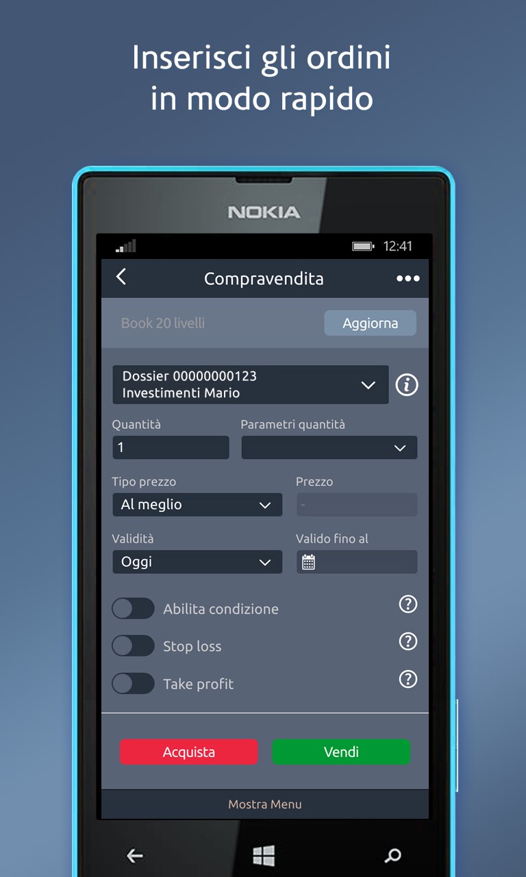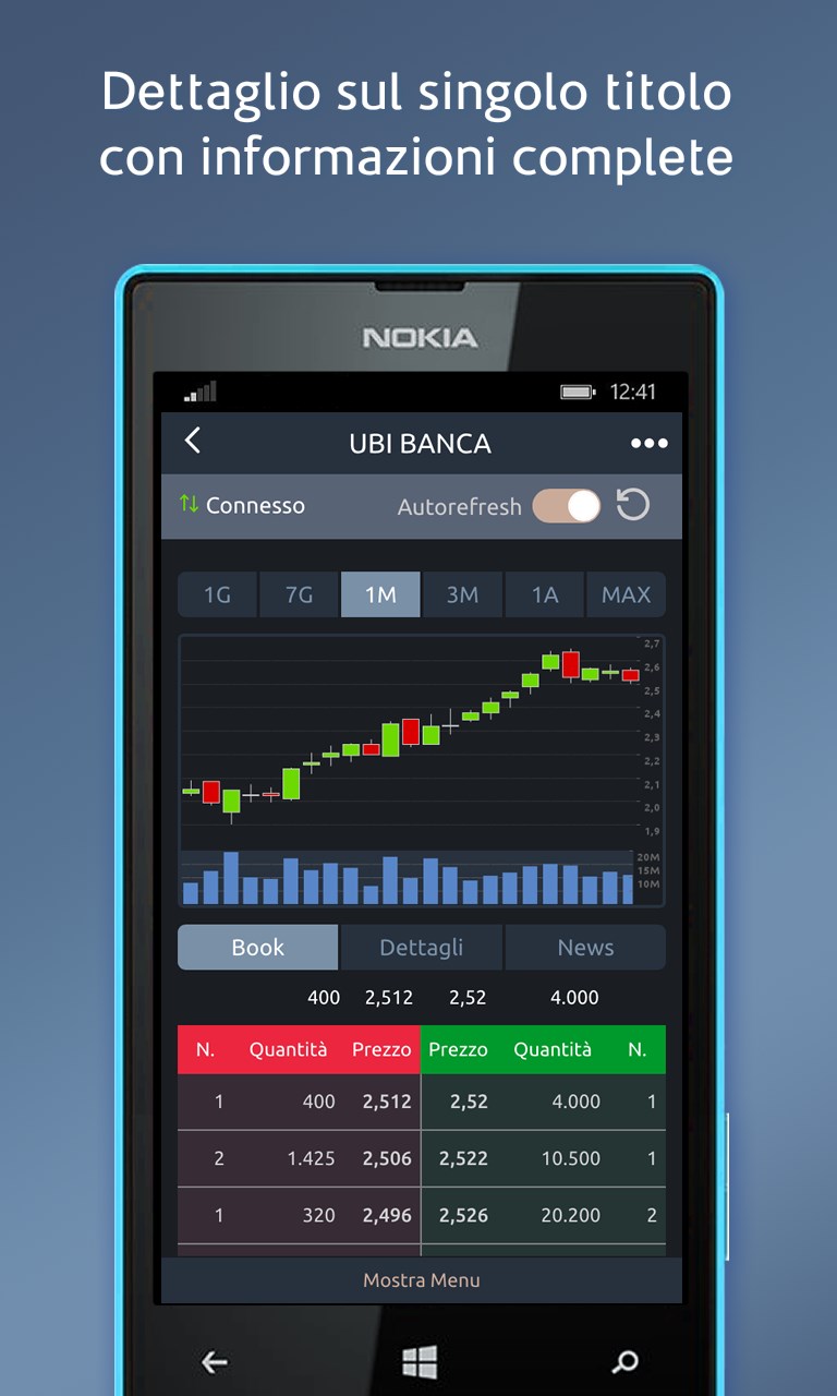 • Inserire gli ordini in modo rapido, avendo un dettaglio sul singolo titolo con informazioni complete, quotazioni in push sul book a 5 e 20 livelli, news e grafici.