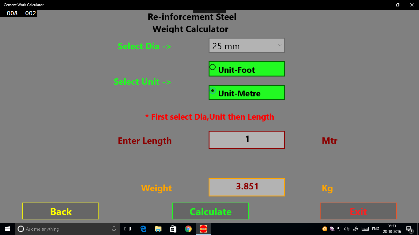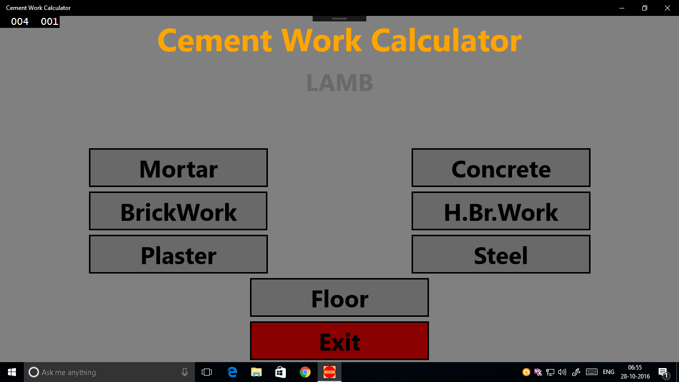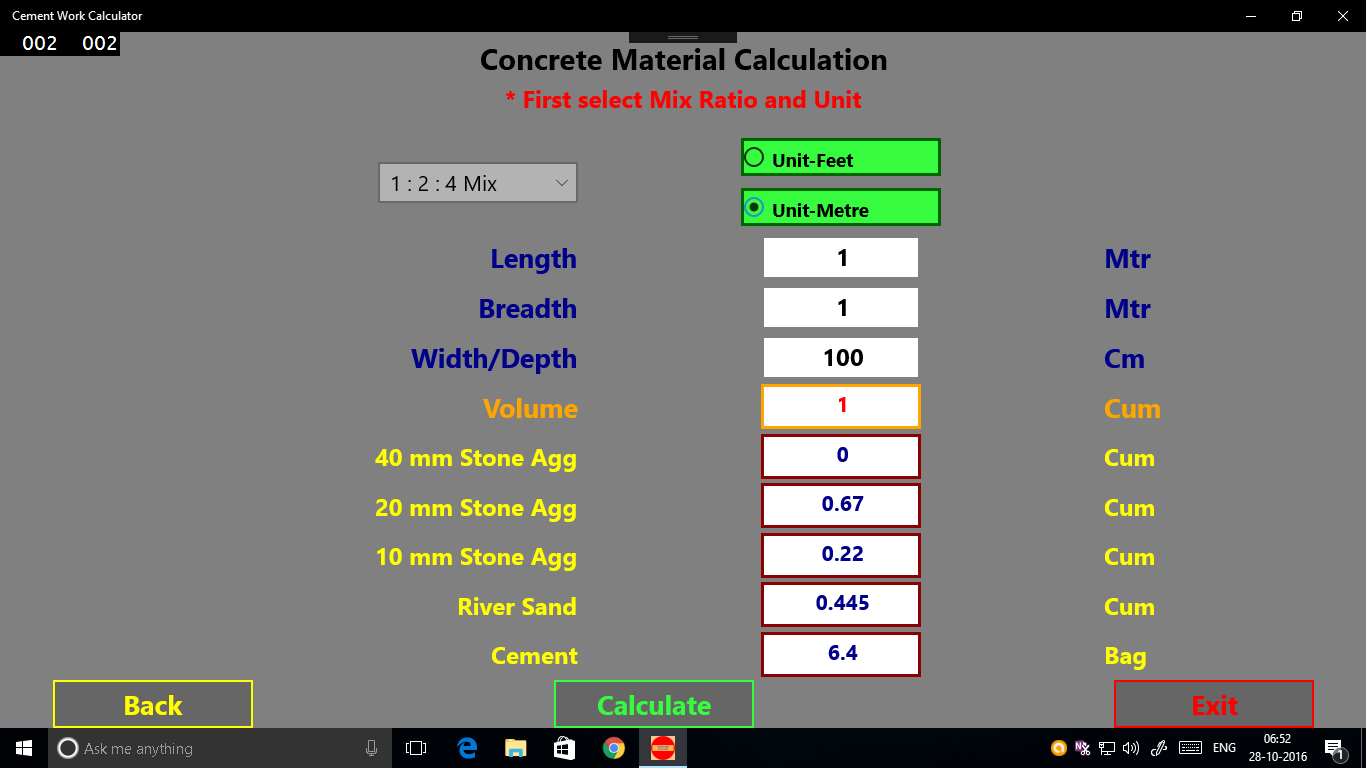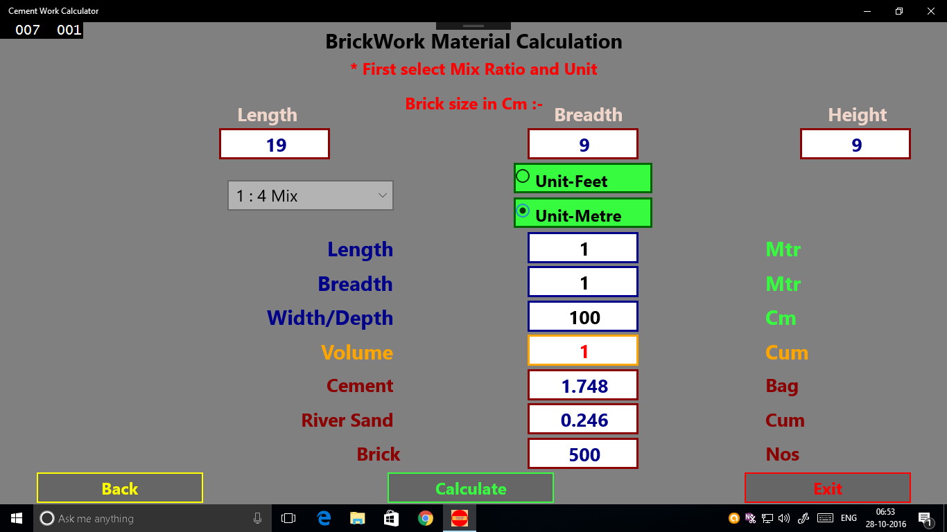 This is a simple Calculator, by which you can calculate the quantity of materials needed for the particular cement work.So that you can estimate for any cement bound work easily.