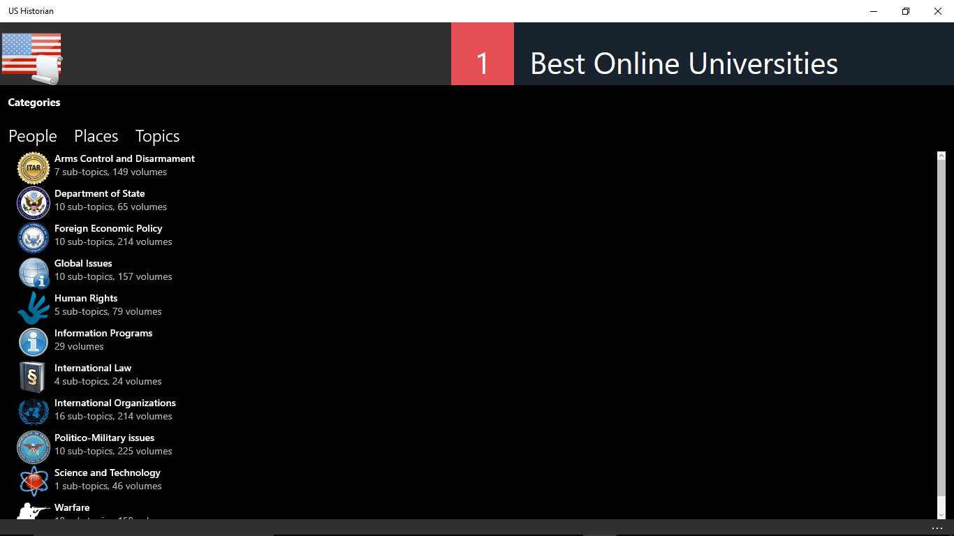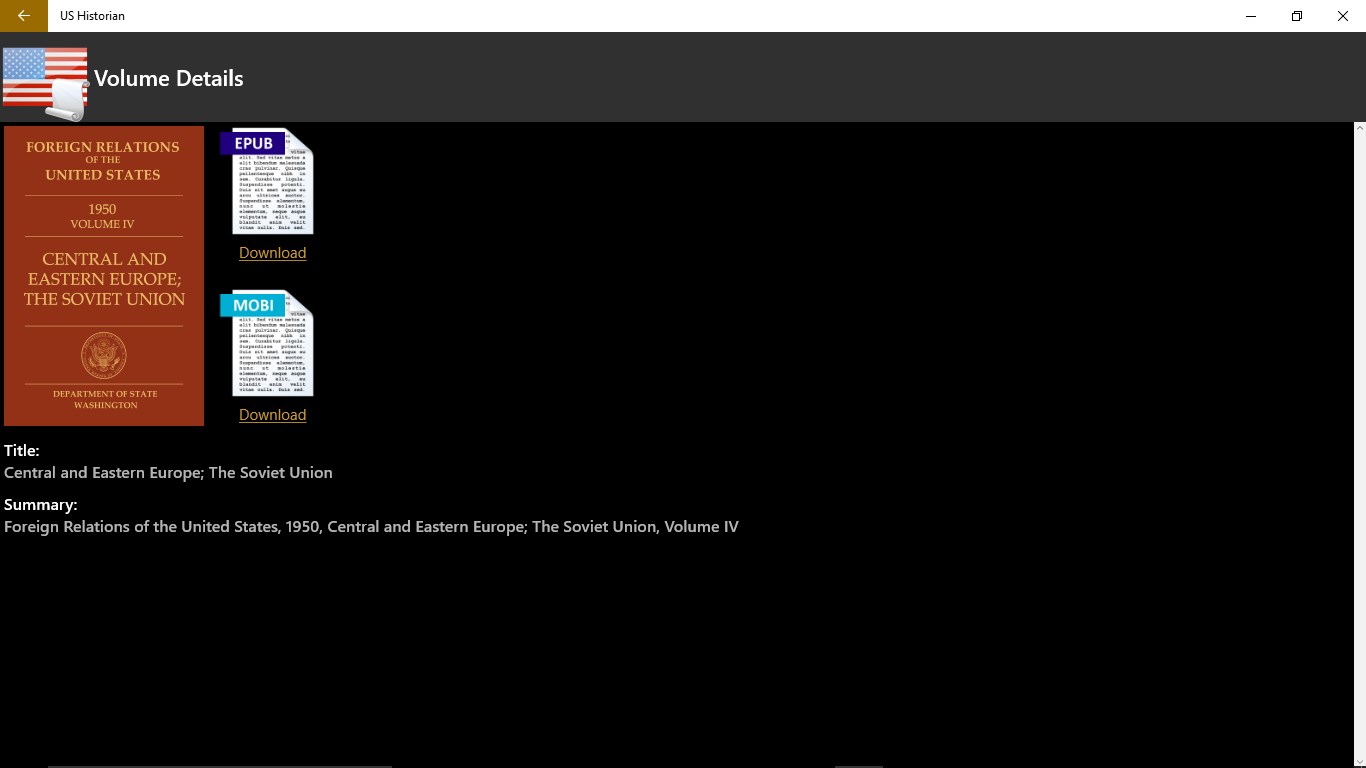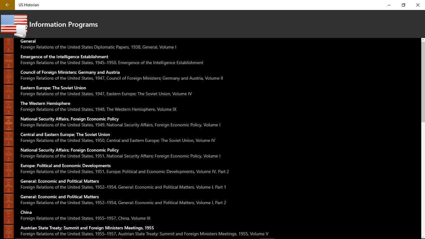 The U.S. Historian application allows you to view the publications of the official documentary history of U.S. foreign policy. This app makes it easy for you to access the eBook publications that cover: