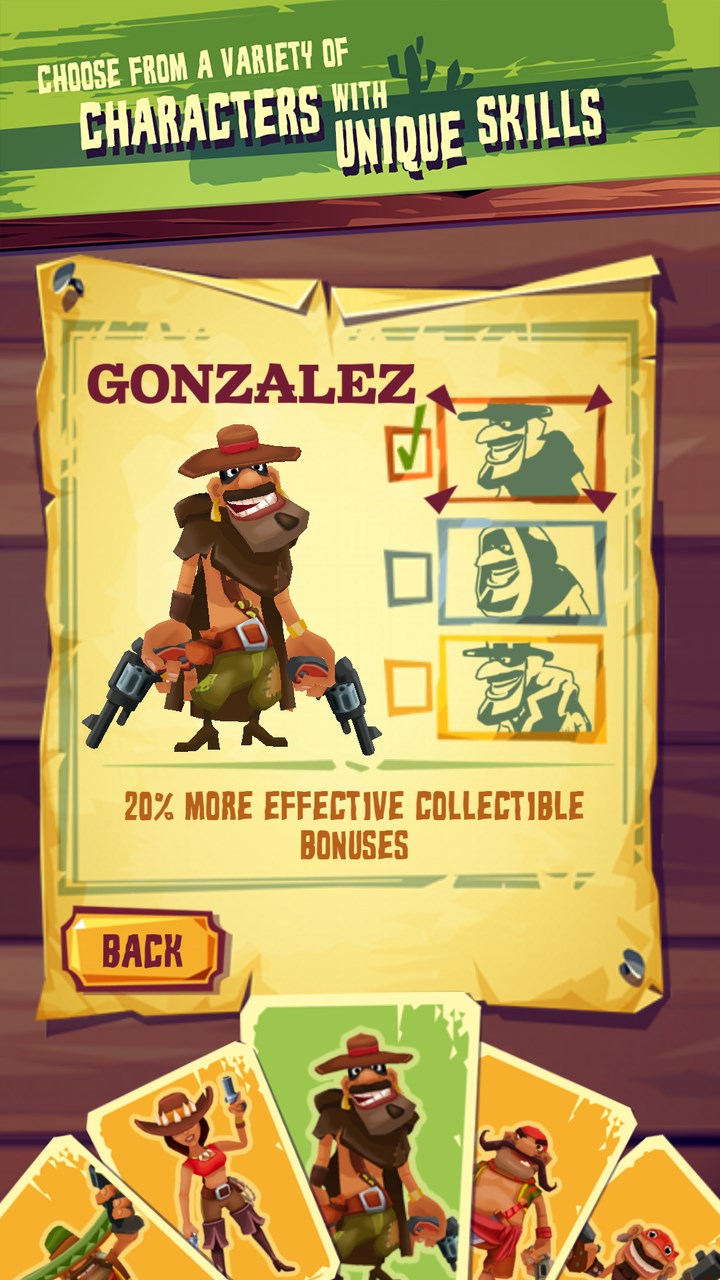 - Choose among various banditos, each having unique powerful skills