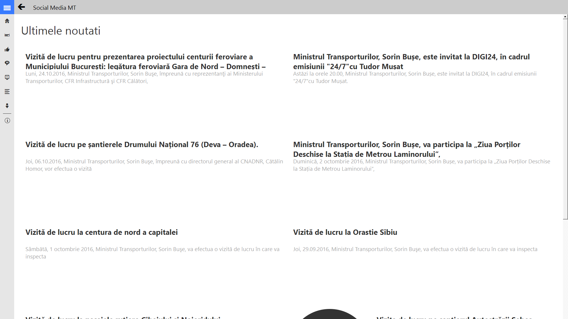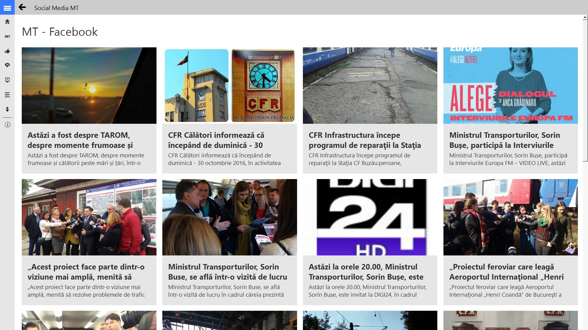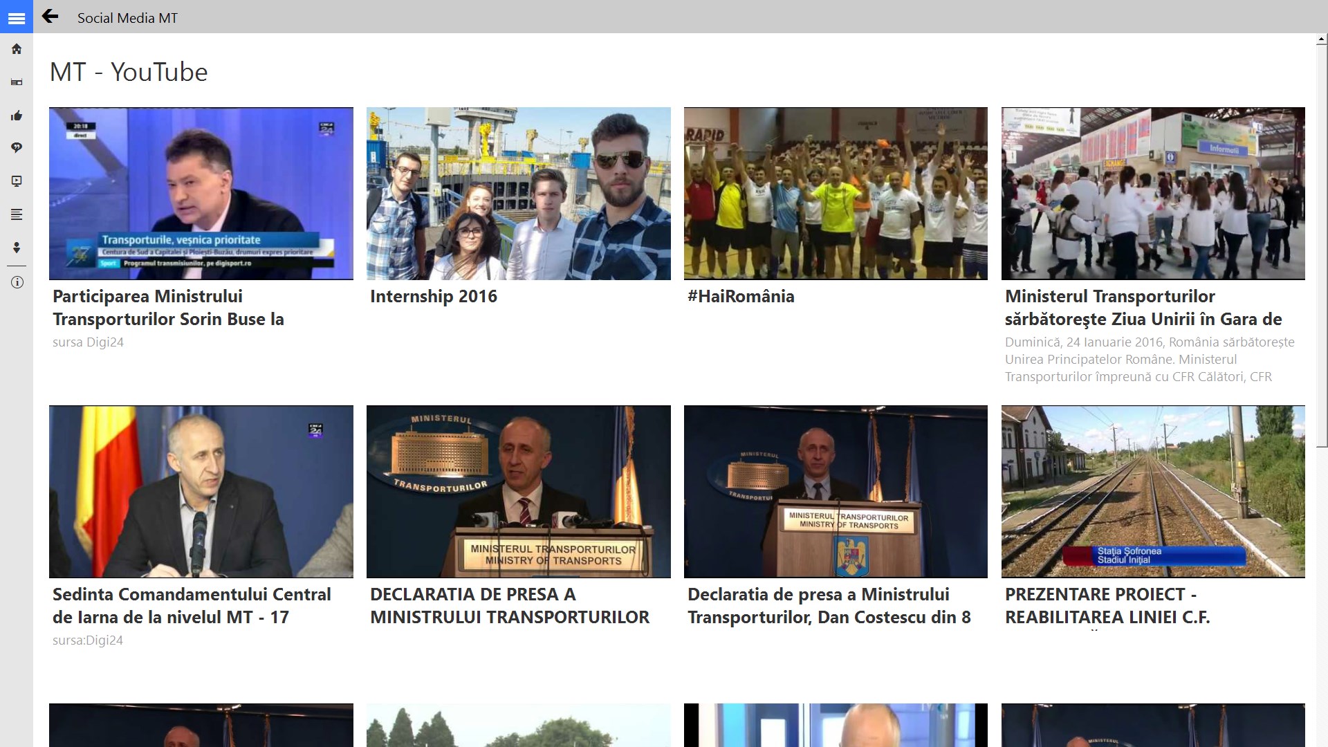 Ministerul Transporturilor oferă celor interesați o modalitate simplă, ușoară și directă de a intra în contact cu administrația publică centrală. Astfel, prin această aplicație aveți acces direct la paginile ministerului din principalele rețele sociale.