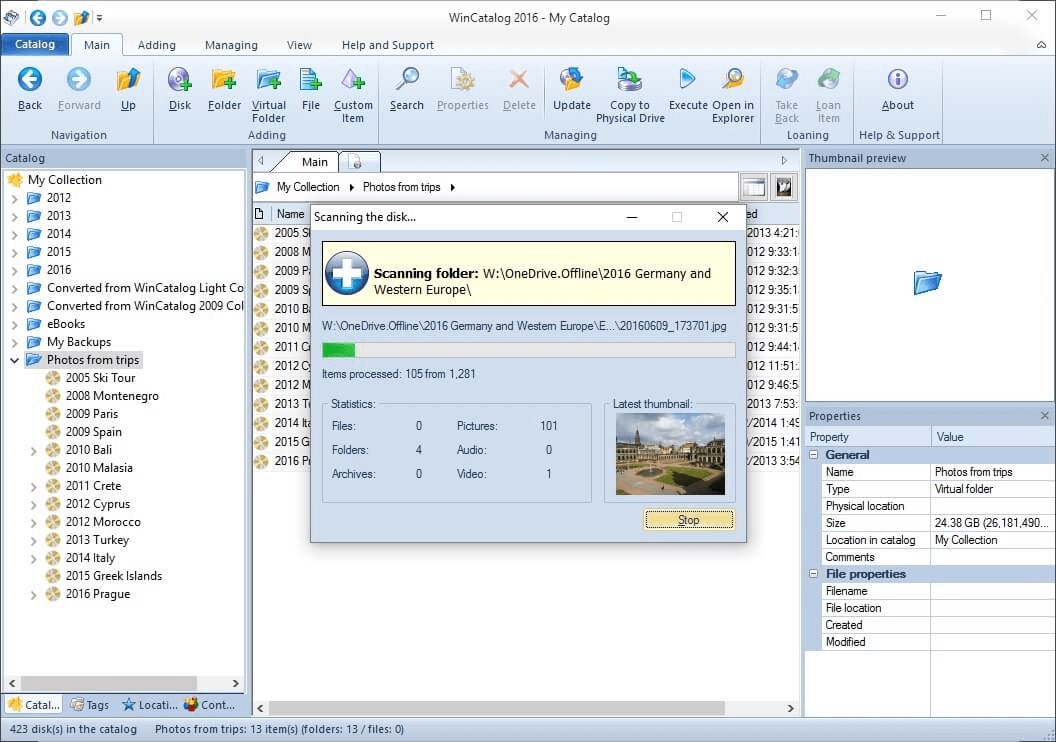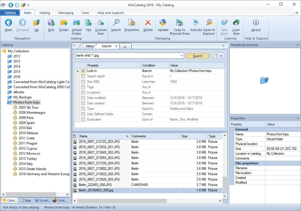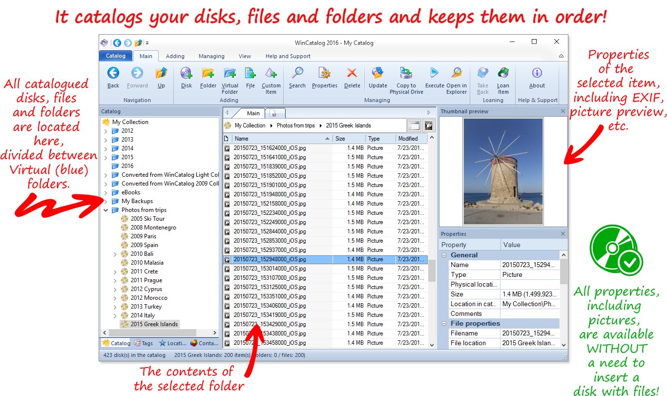 Unlimited catalog size and extremely high operating speed while processing disk catalog, thanks to industrial database standards and SQLite DBMS.An ability to add virtual folders and move items between them.An ability to tag disks, files and folders, and use as many tags as you wish. Some tags are created automatically.An ability to create any user defined fields.An ability to run files directly from WinCatalog.Advanced powerful search: both typical search algorithm using simple queries and the advanced search using logical operators AND, OR, parenthesis and quotes.An ability to find duplicate files by matching one or more fields.An ability to filter search results.Multiple search tabs at the same time.WinCatalog grabs picture thumbnails for the most popular image formats and makes them available for preview without a connection to the original files!WinCatalog grabs Exif tags from digital photos including comments, resolution, camera model, focal length, and other metrics.WinCatalog grabs thumbnails and basic media information (duration, resolution, audio channels, etc.) for video files.It extracts ID3 tags (Artist name, Album title, Cover image (see the picture on the right), and Composition name, etc.) and meta data (bitrate, duration, etc.) from music files.An ability to scan inside archives. The supported archives are: Zip (including the new Zipx), Rar, and 7zip.Scanning the contents of ISO disk images.All processing settings are adjustable and can be modified.When the contents of the disk changes, WinCatalog updates it very quickly. It skips unmodified files -it makes the update process very fast.When the disk data is updated, the previously entered comments and tags (keywords) are preserved.