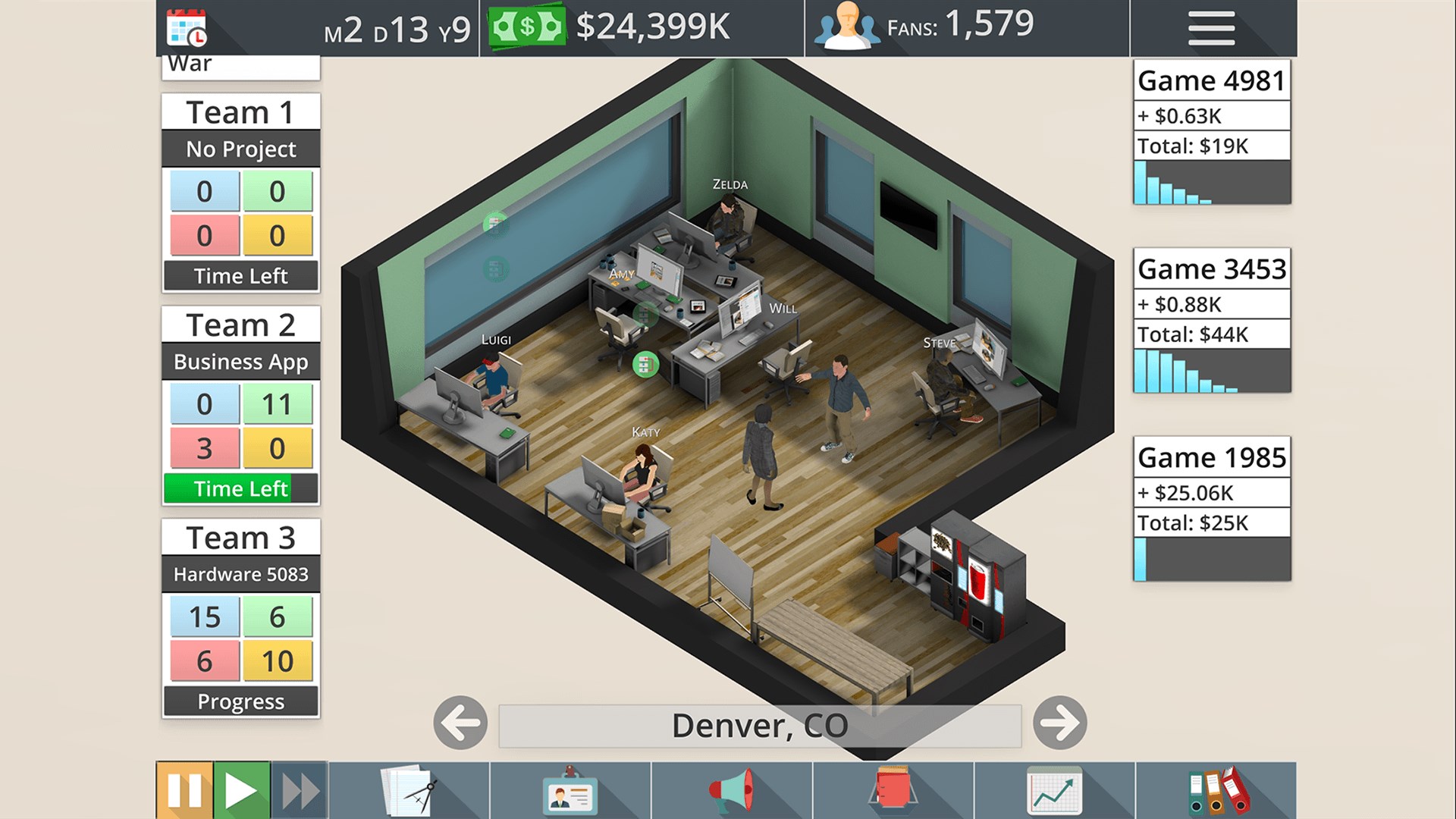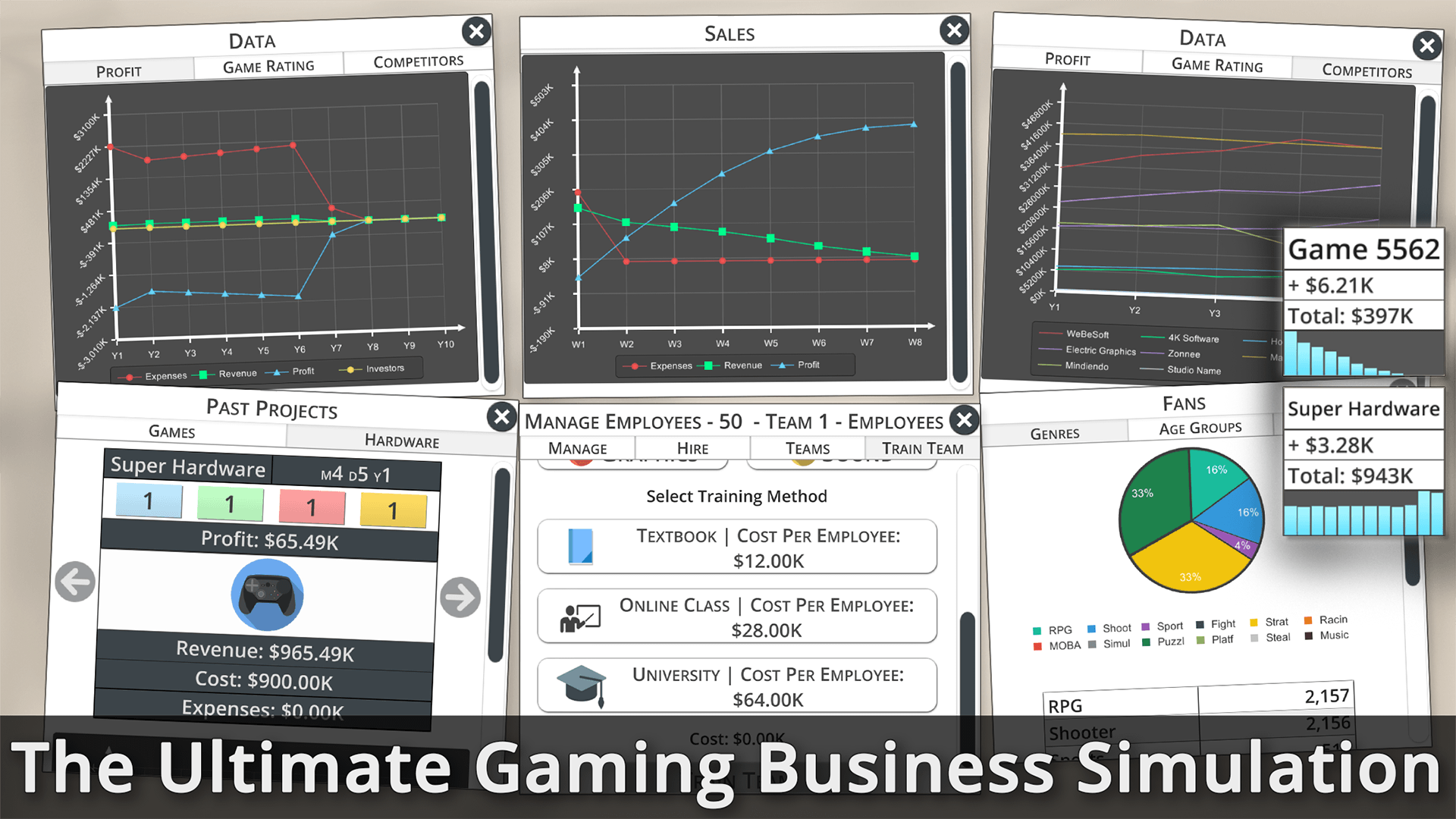 • Analyze and strategize! Pour over various charts and graphs to determine what games you should make and decide what direction to take your company in.