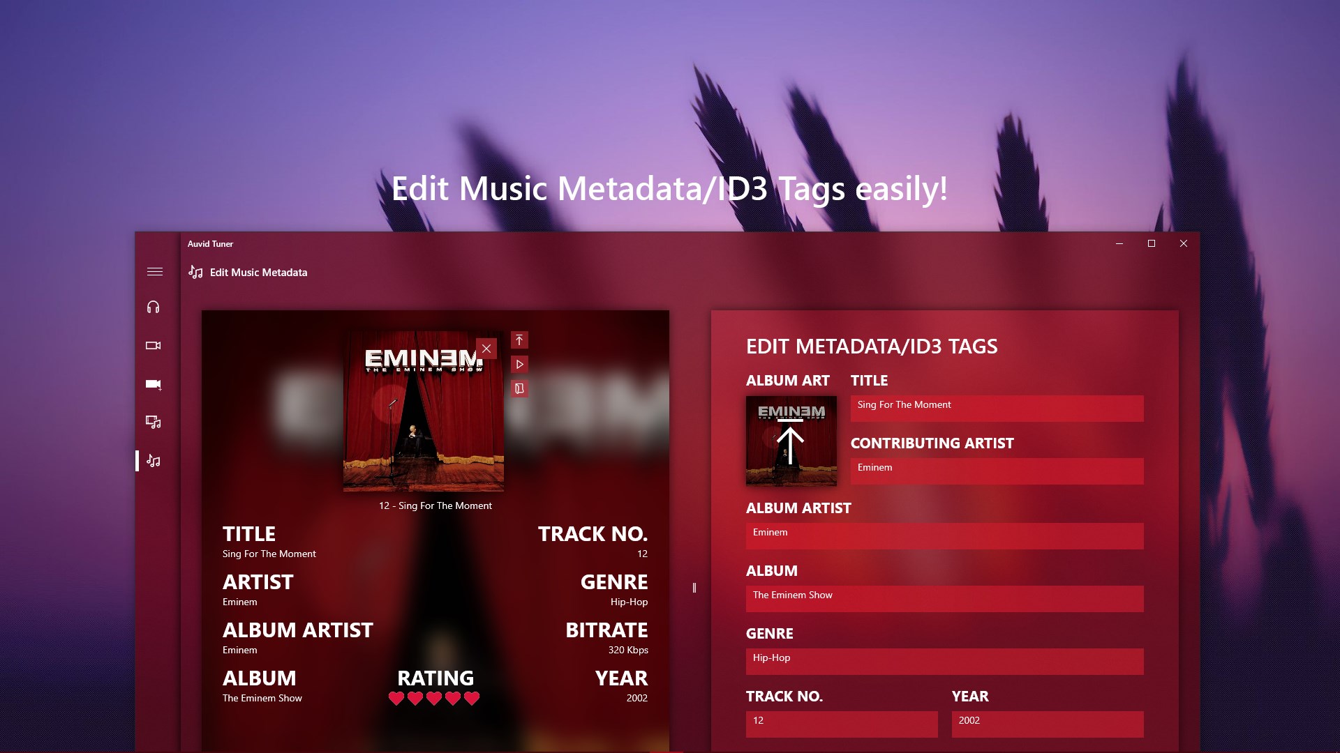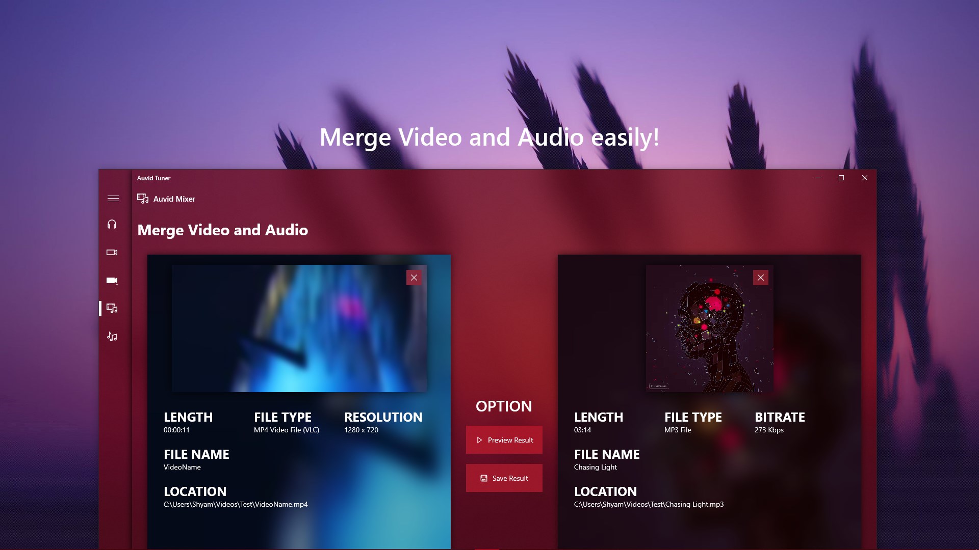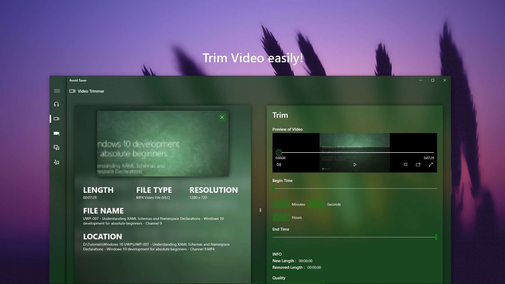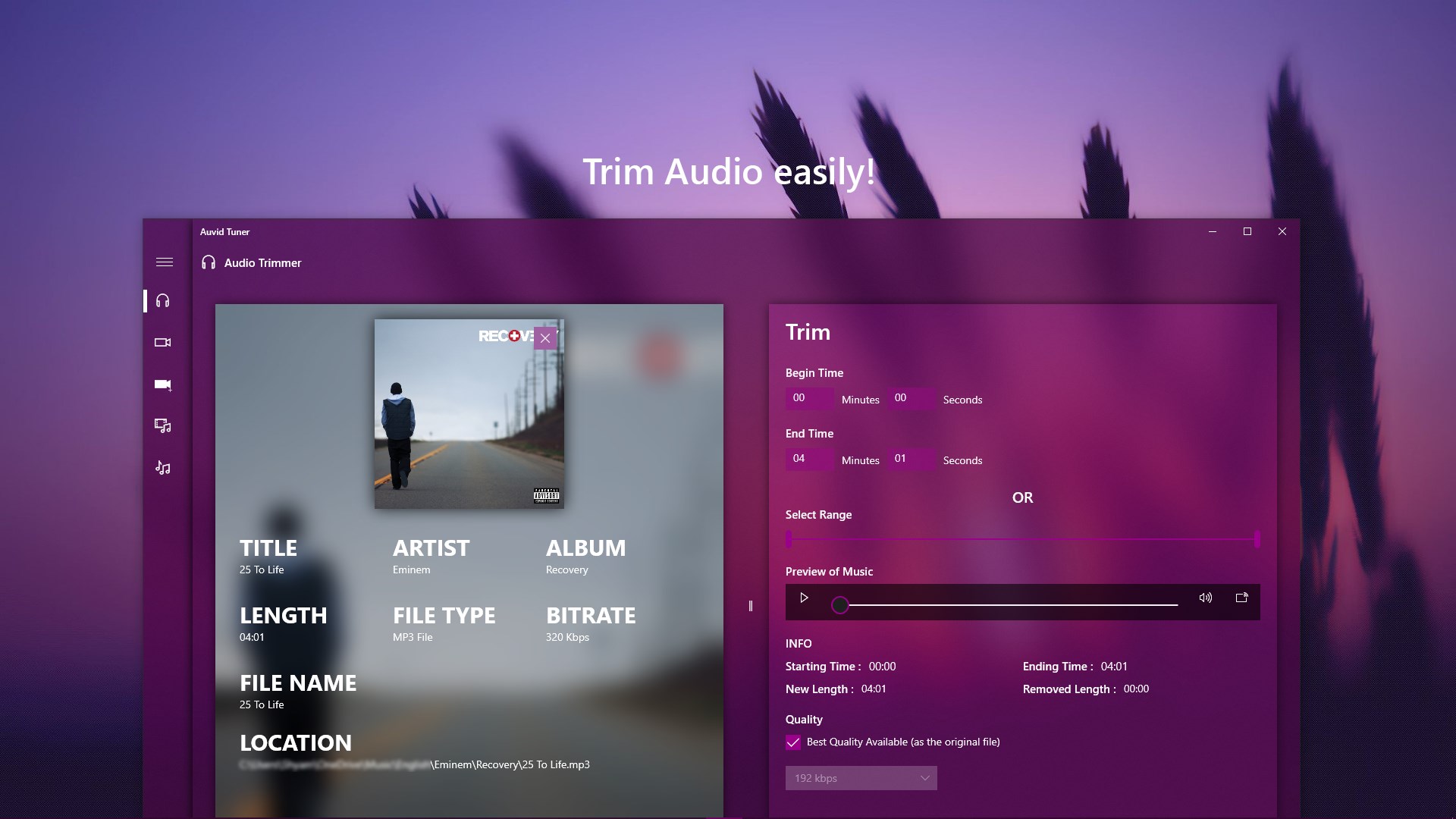 Auvid Tuner lets you easily trim/cut your Audio and Video files, Combine multiple Videos clip, Edit Music Metadata/ID3 Tags and mix Audio and Video into one...