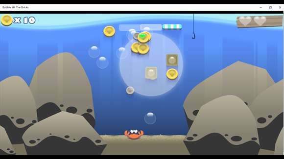 Left and right drag crabs and use bubbles to destroy the debris in the sea. Once the pieces are destroyed, the pieces may fall to the precious gold coins, which can be used to buy props and extra life. The whereabouts of hooks on the rational use of props, you can live longer. If the bubble falls on the ground or the crab is hit by the debris, that's all.
