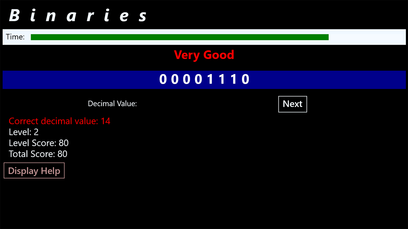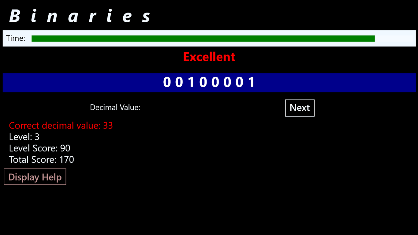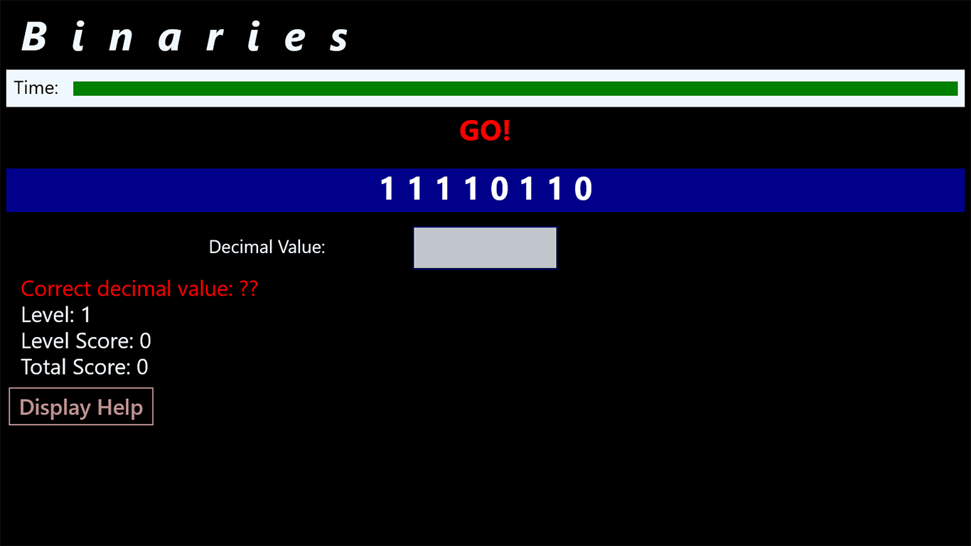 The game will display a random binary number, you should place the corresponding decimal value within a specific time.