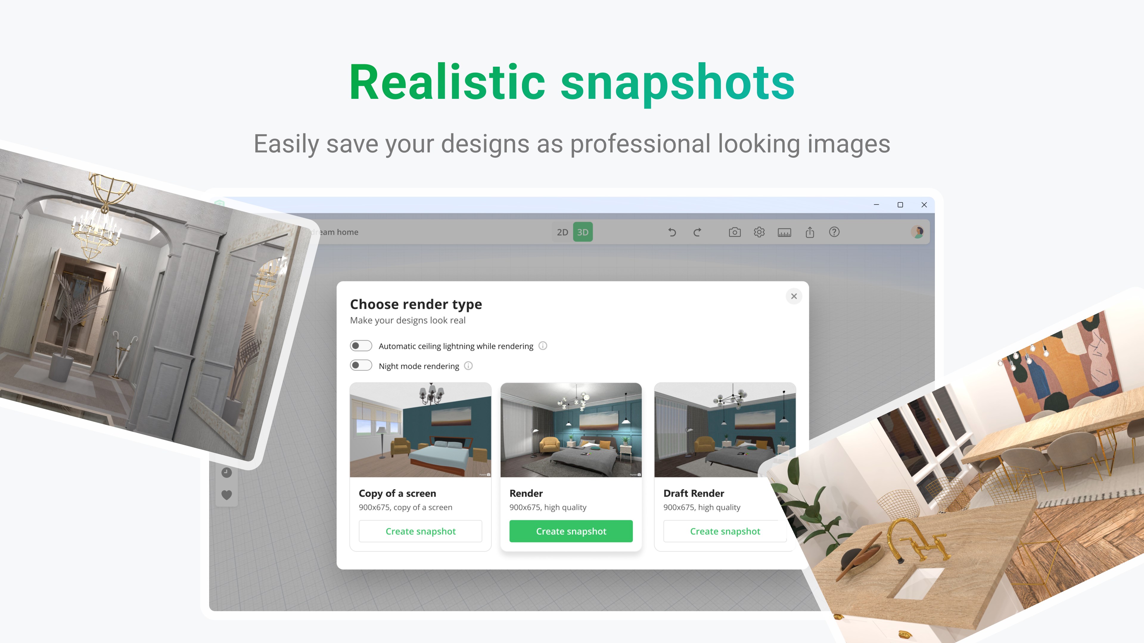 • Use 'SNAPSHOT' feature to create photo-realistic images of your projects with realistic lighting, textures, and shadows