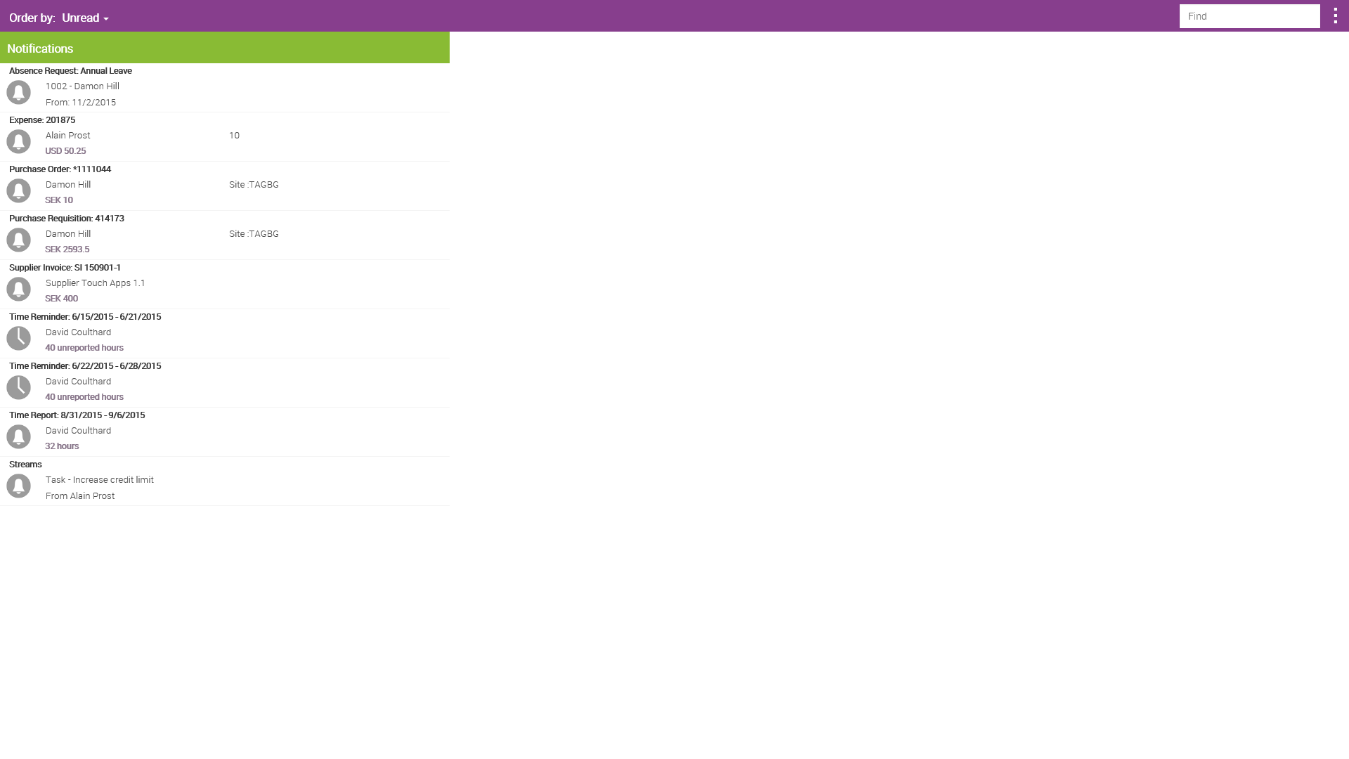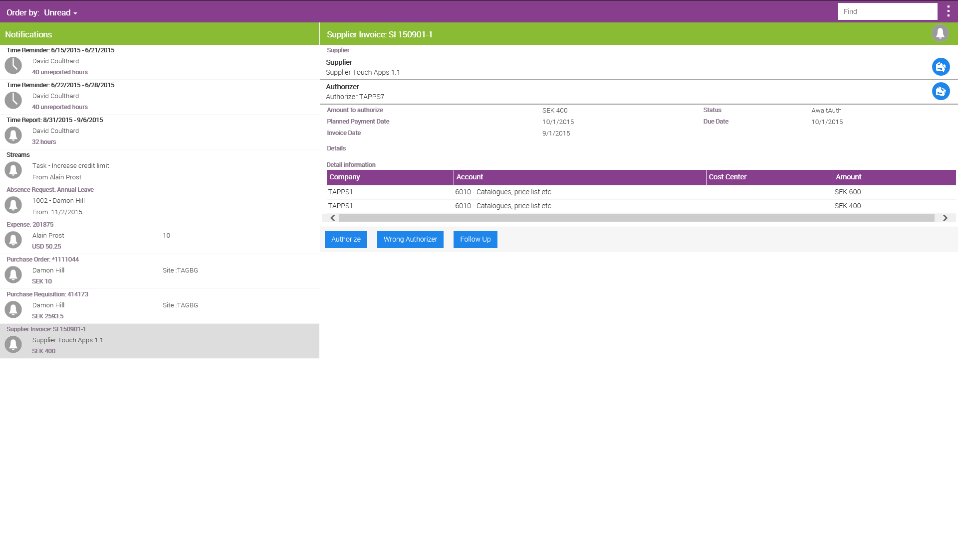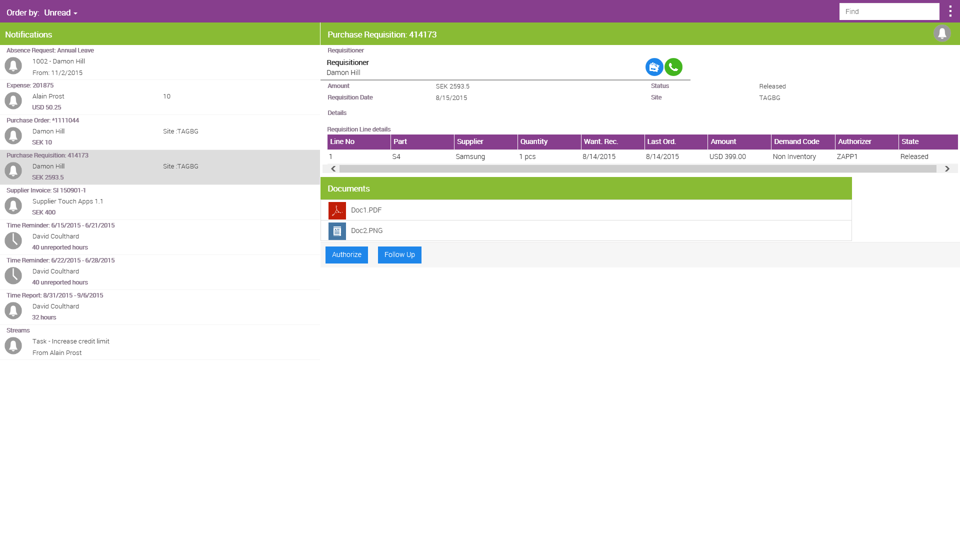 Authorize supplier invoicesAuthorize purchase orders and purchase requsitionsAuthorize time reports and travel expensesView invocie documents (PDF, TIF) for scanned invoicesGet reminders for employees who have not reported their timeCreate follow-up tasksE-mail/call contacts mention on the invoice, exense sheet etc.