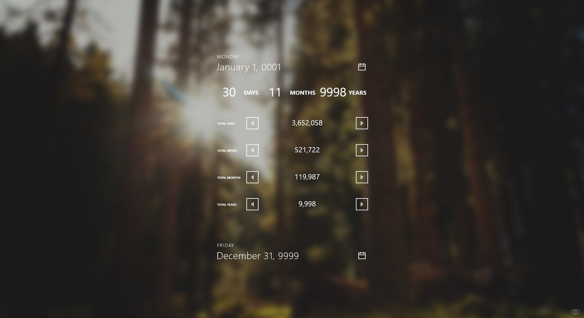 Do you need to know how many days, weeks, months, or years have passed since you were born. Do you need to know what the date will be in 2 years, 4 months, and 23 days from now? This app has got you covered.