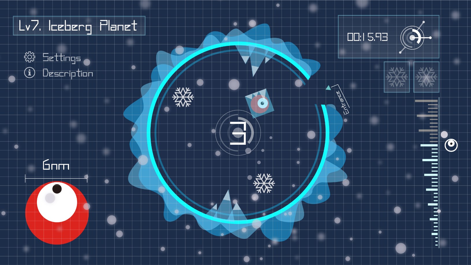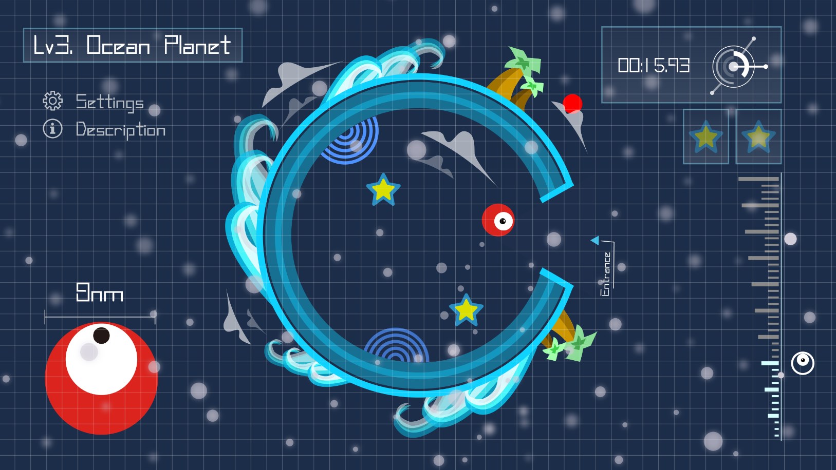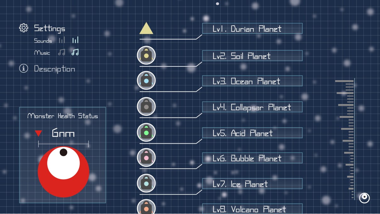 用户们可以重力感应,控制星球的转动,使得在星球内随机运动的小怪兽躲避潜在危险并顺利从星球的缺口逃出。