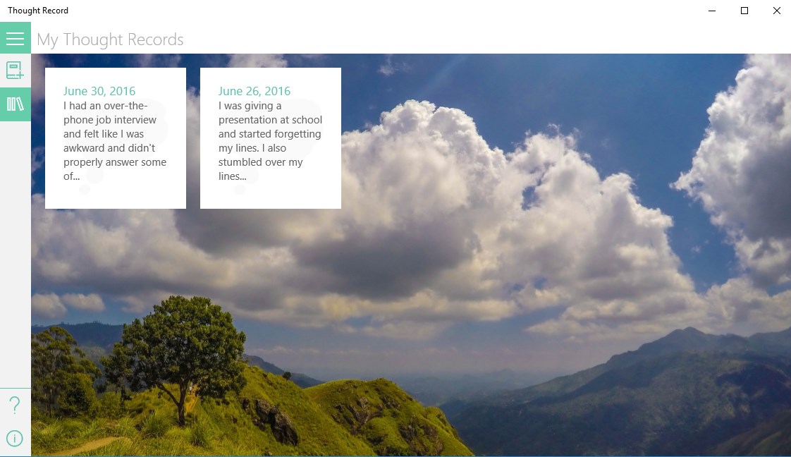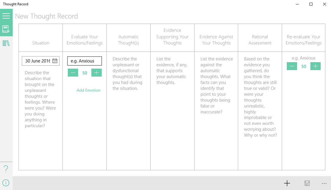 Thought records have long been used in cognitive behavioral therapy to deal with dysfunctional thinking related to conditions such as anxiety, depression and obsessive compulsive disorder. With this app, you have the ability to easily create and save thought records on Windows 10 devices.
