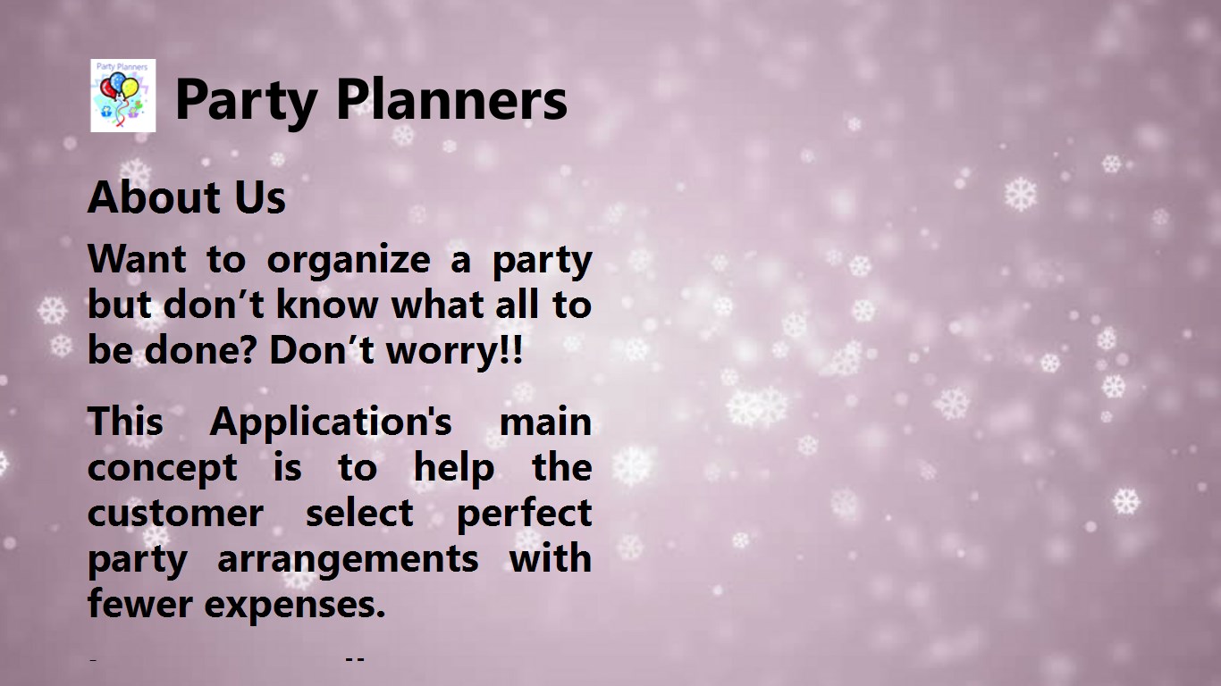 This Application's main concept is to help the customer select perfect party arrangements with fewer expenses.