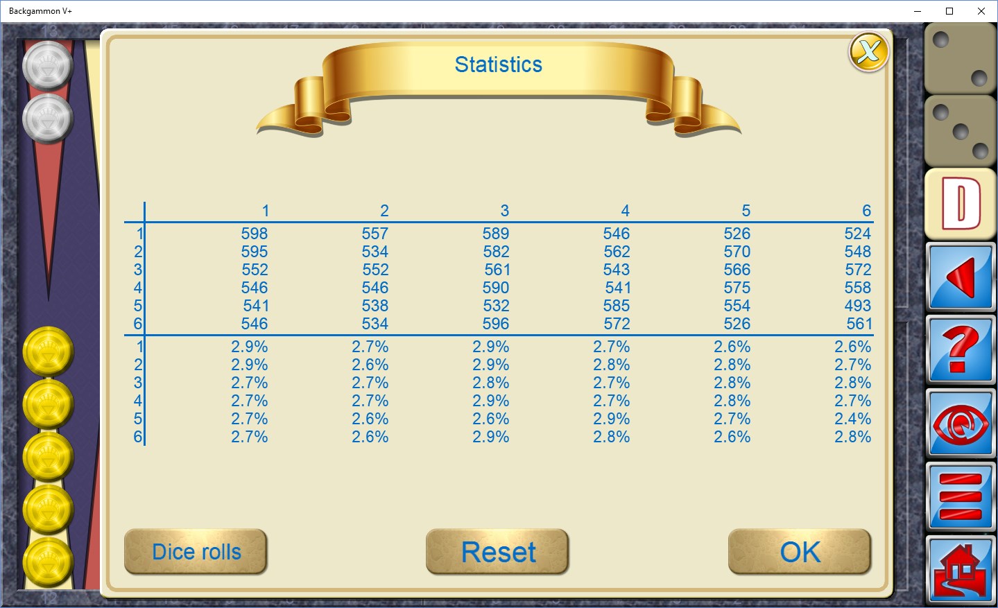 Backgammon is a simple race game. The object is to move the pieces around the board towards your inner table. Once all 15 of your pieces have arrived in the inner table, they can be removed from the board. The first player to remove all his pieces from the board is the winner. Although the play is highly skilful, the fact that the moves rely on the roll of the dice introduces an element of luck allowing even a novice to win the odd game against a world champion.