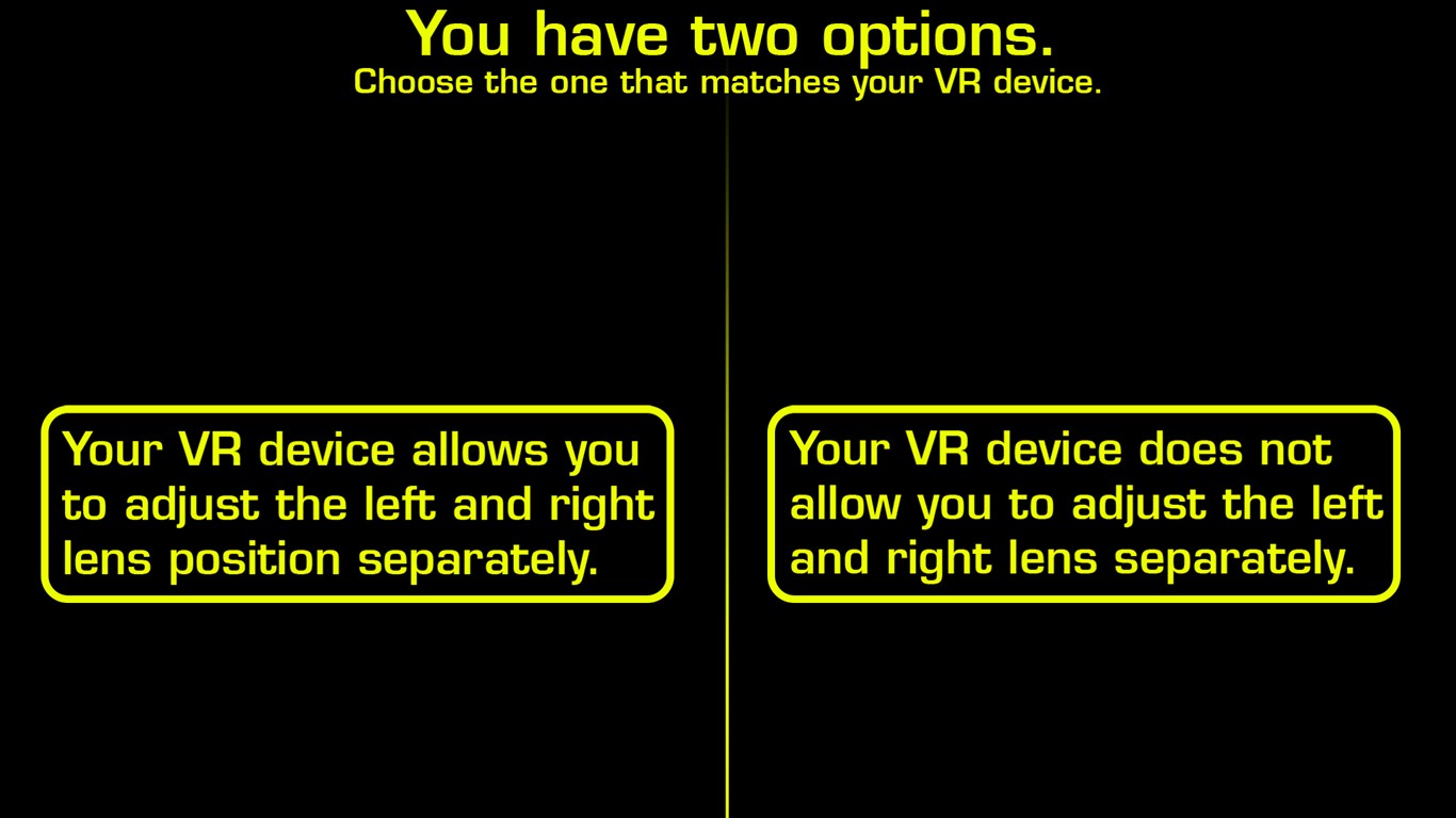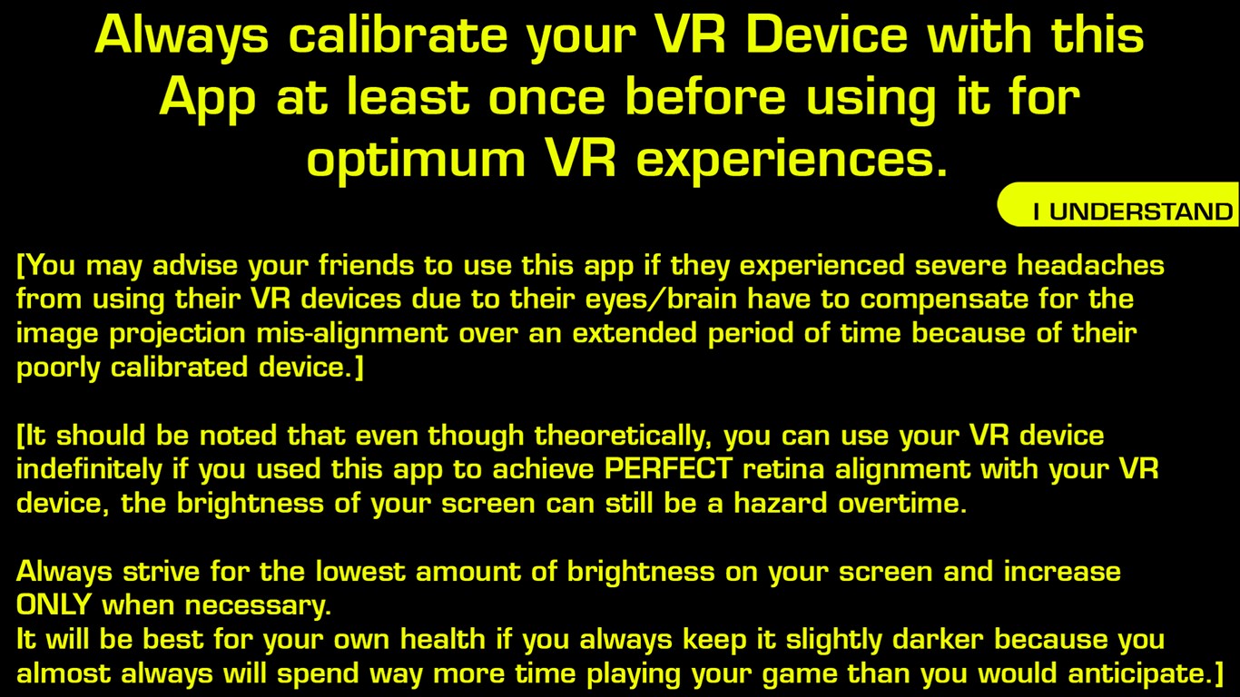 Calibrate your VR Device specifically to you using this tool to prevent nausea and headache from extended use of your VR Device.