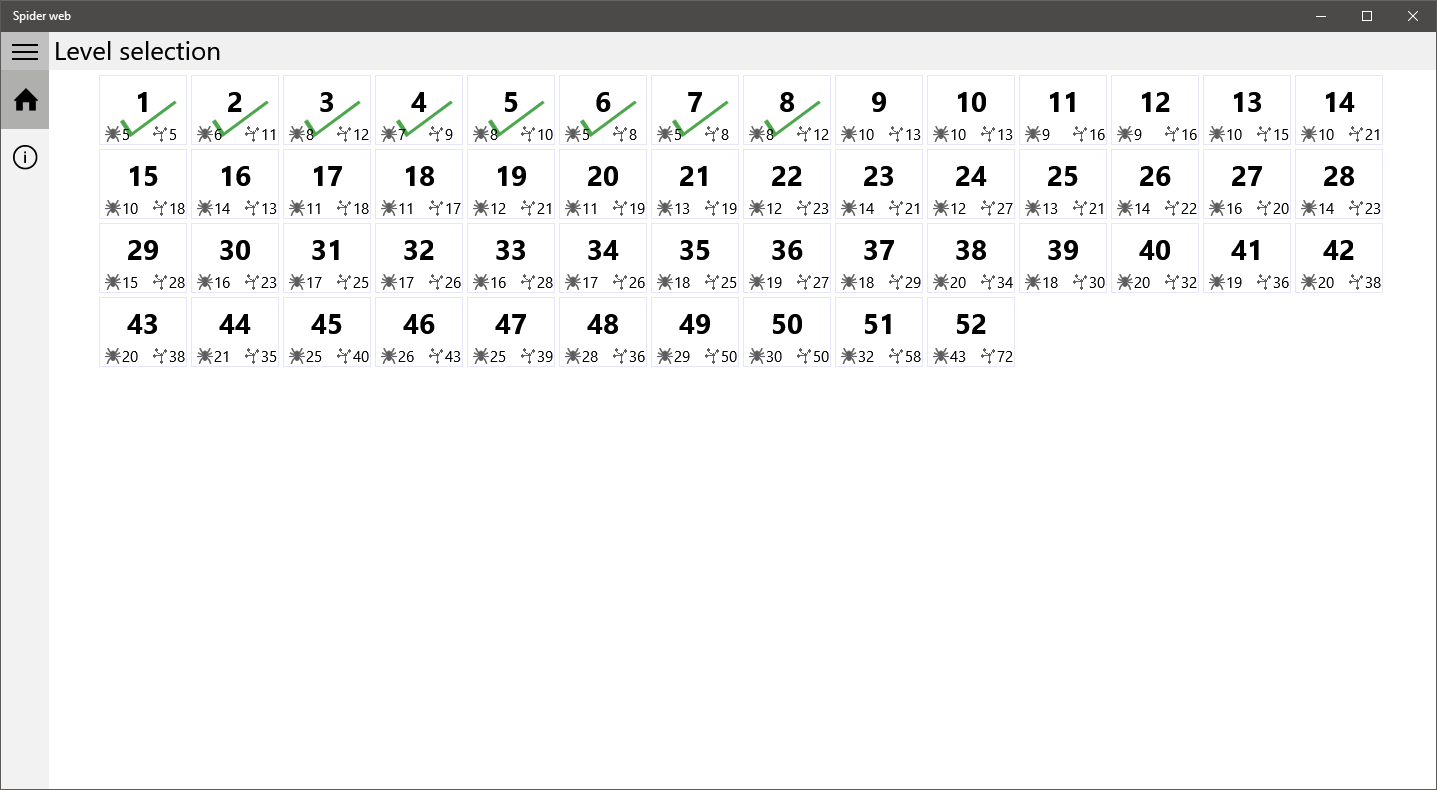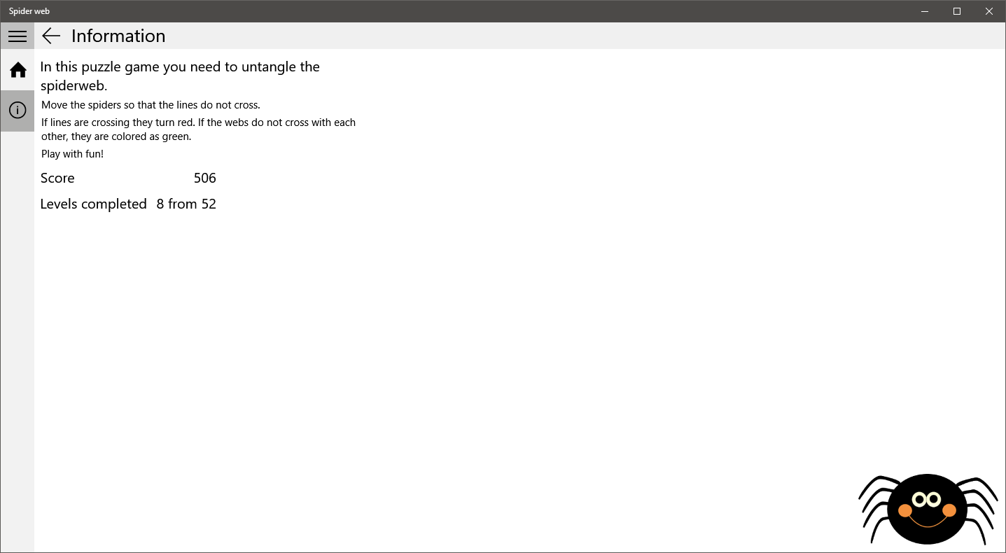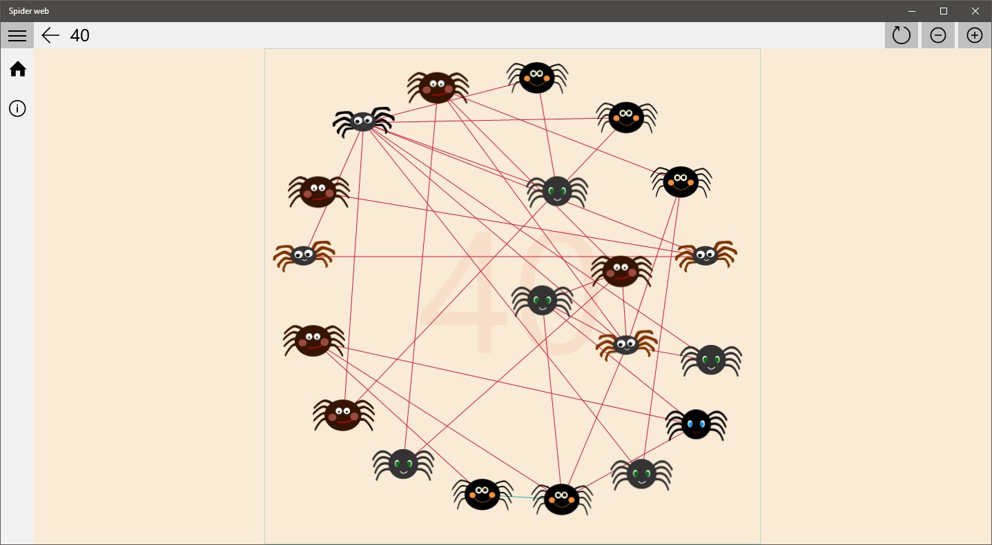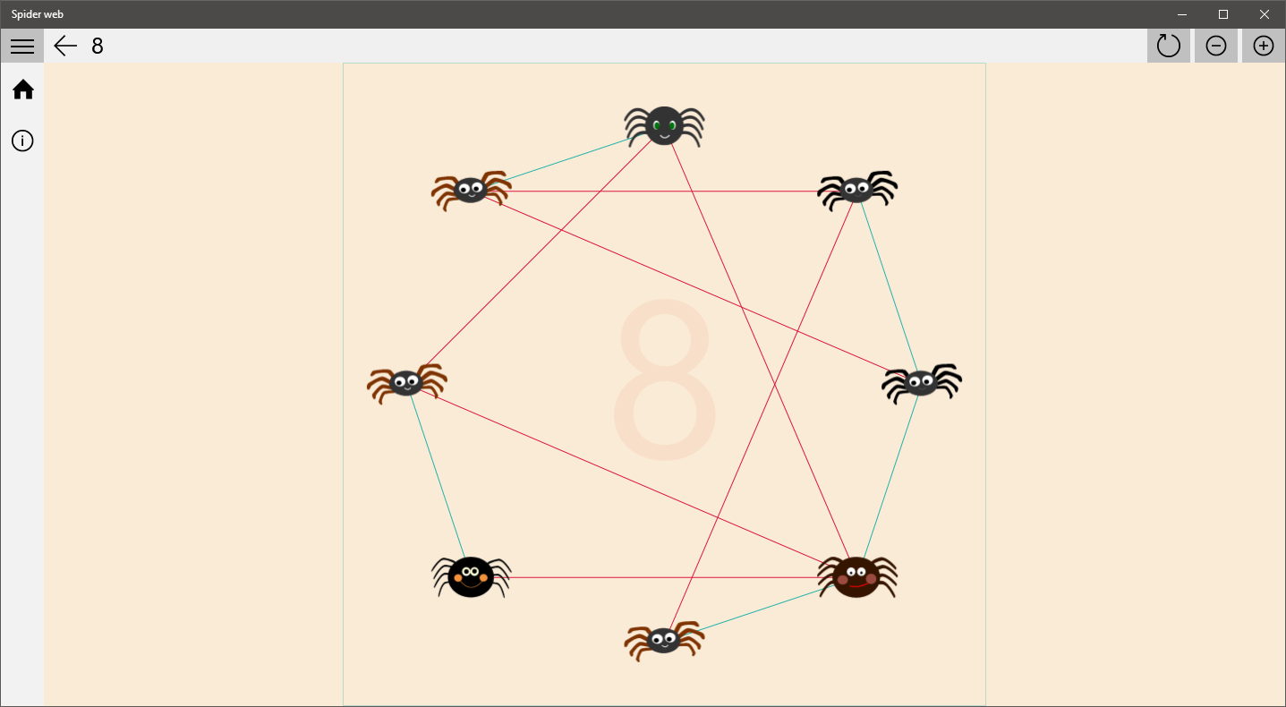 Move the spiders so that the lines do not cross with each other. If lines are crossing - they turn red, if not - they turn green. Play with fun!
