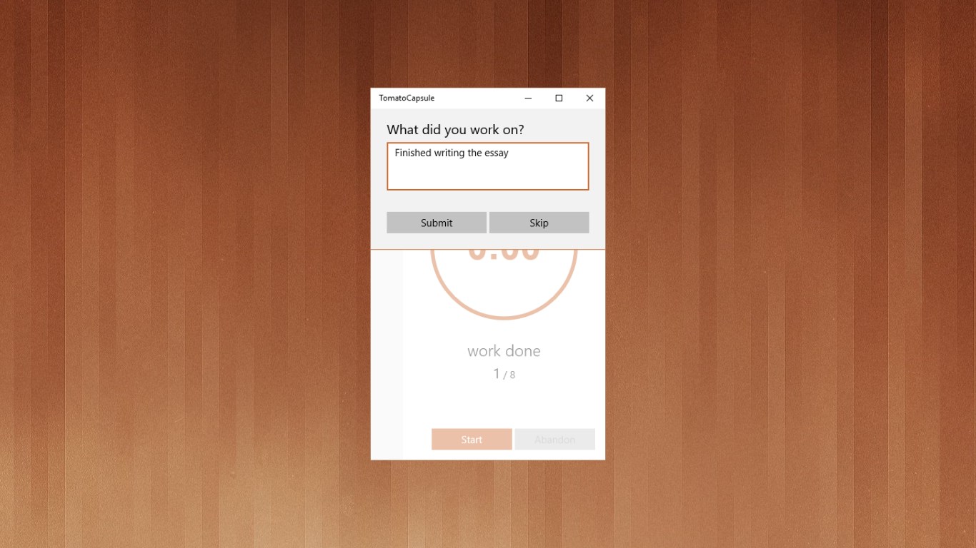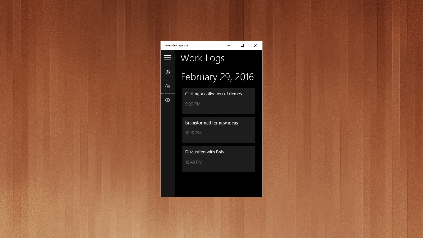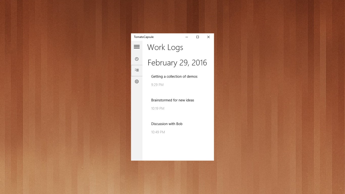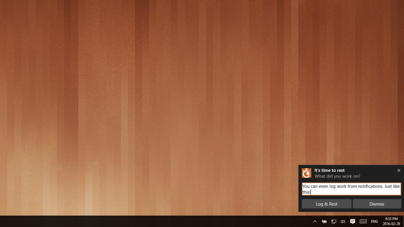 Elegant, clutter-free user interface.Flexible work and rest time length.Integrated work logging.Timer activation and work activity logging actionable from notifications, all without opening the app.Seamless work activity log syncing between your Windows 10 devices.