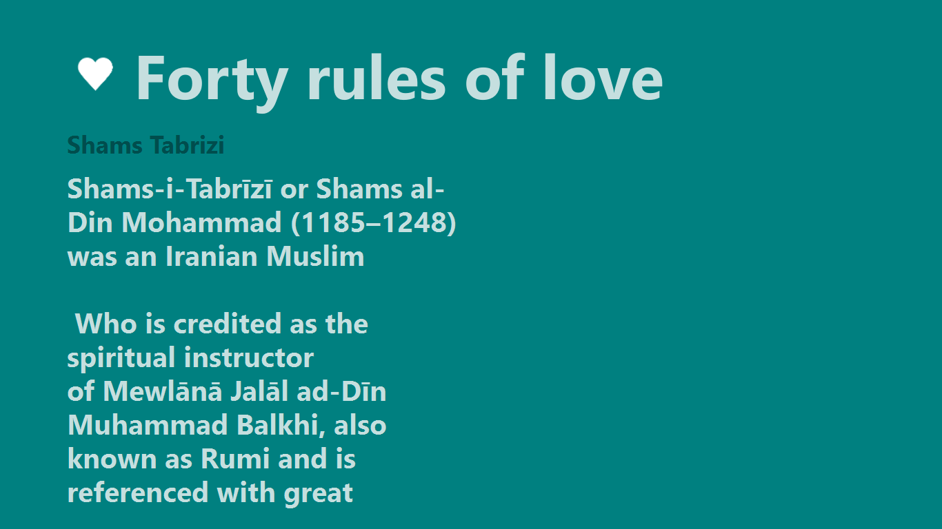 This app is about Shams Tabrizi and his 40 rules of love that he taught Rumi.