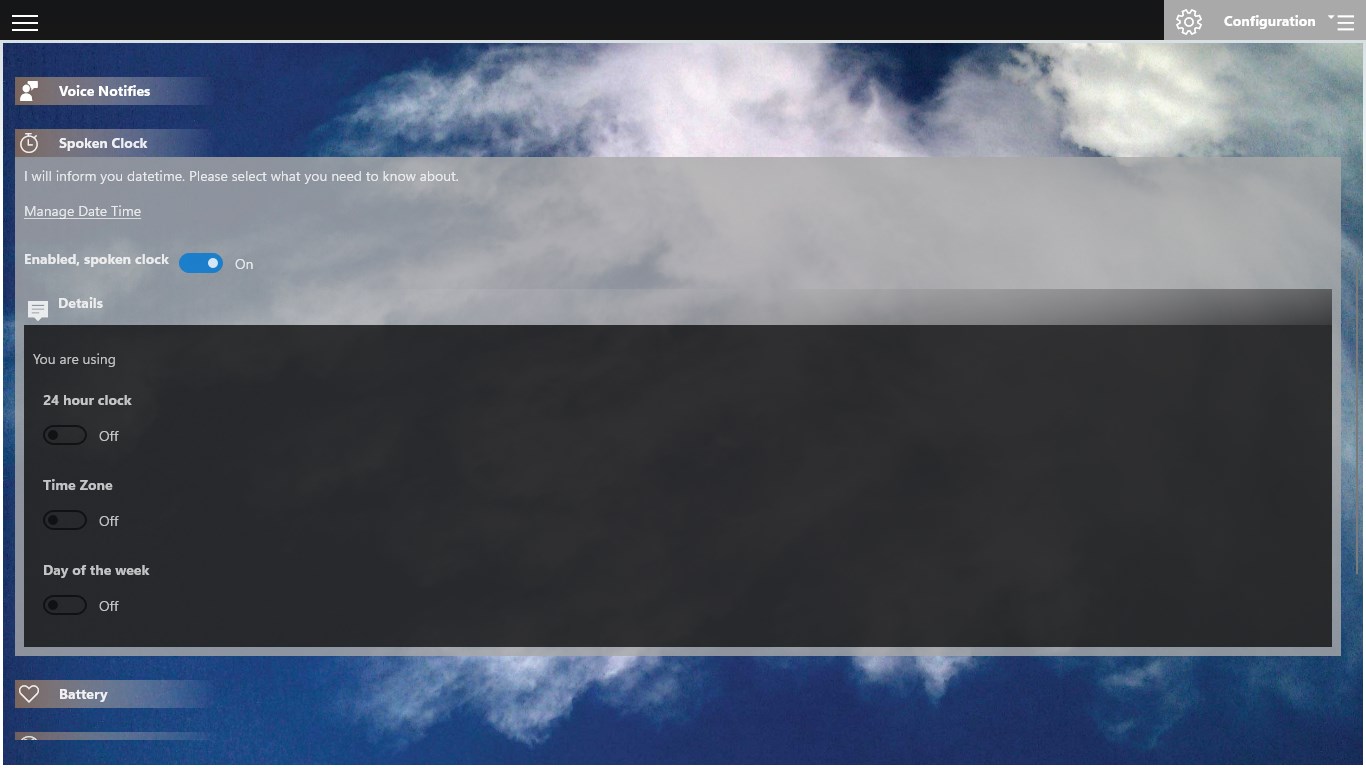 Voice notifies time window is 30s. Datetime and day of the week voice notifies is skipped when battery is charging.